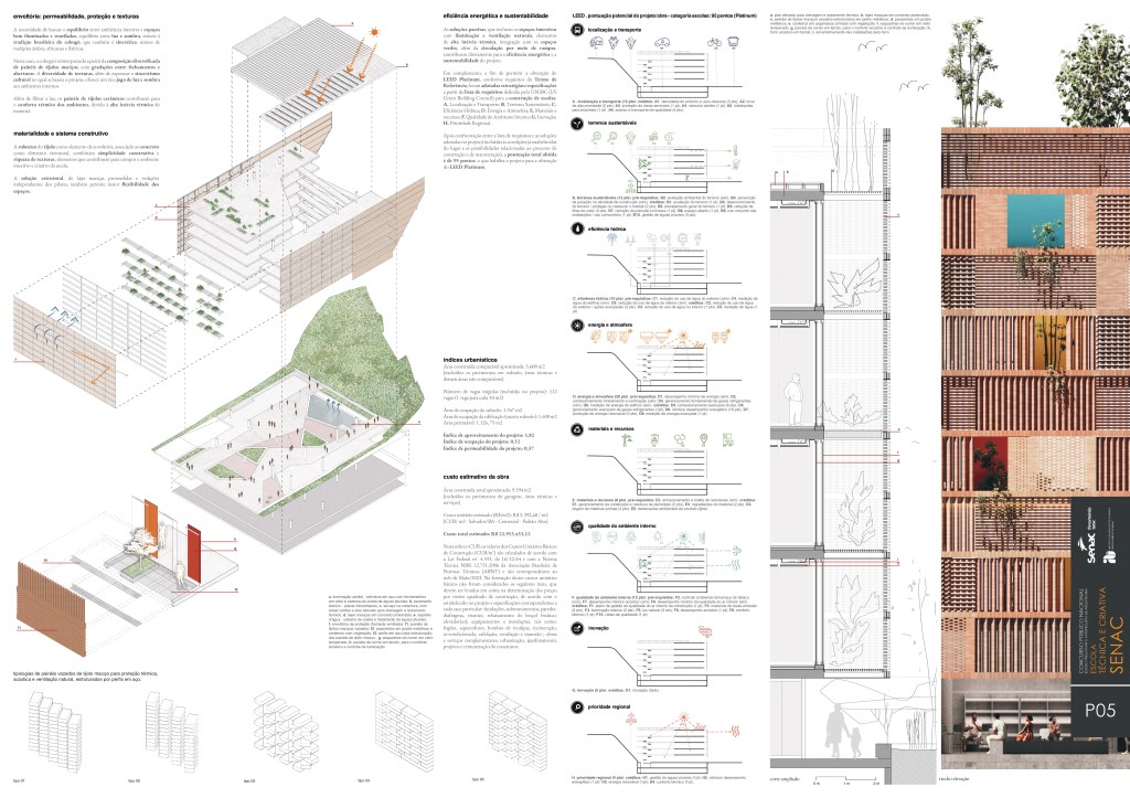 Em complemento, a fim de permitir a obtenção do LEED Platinum, conforme requisitos do Termo de Referência, foram adotadas estratégias e especificações a partir da lista de requisitos definida pelo USGBC (US Green Building Council) para a construção de escolas: A. Localização e Transporte; B. Terrenos Sustentáveis; C. Eficiência Hídrica; D. Energia e Atmosfera; E. Materiais e recursos; F. Qualidade do Ambiente Interno; G. Inovação; H. Prioridade Regional.