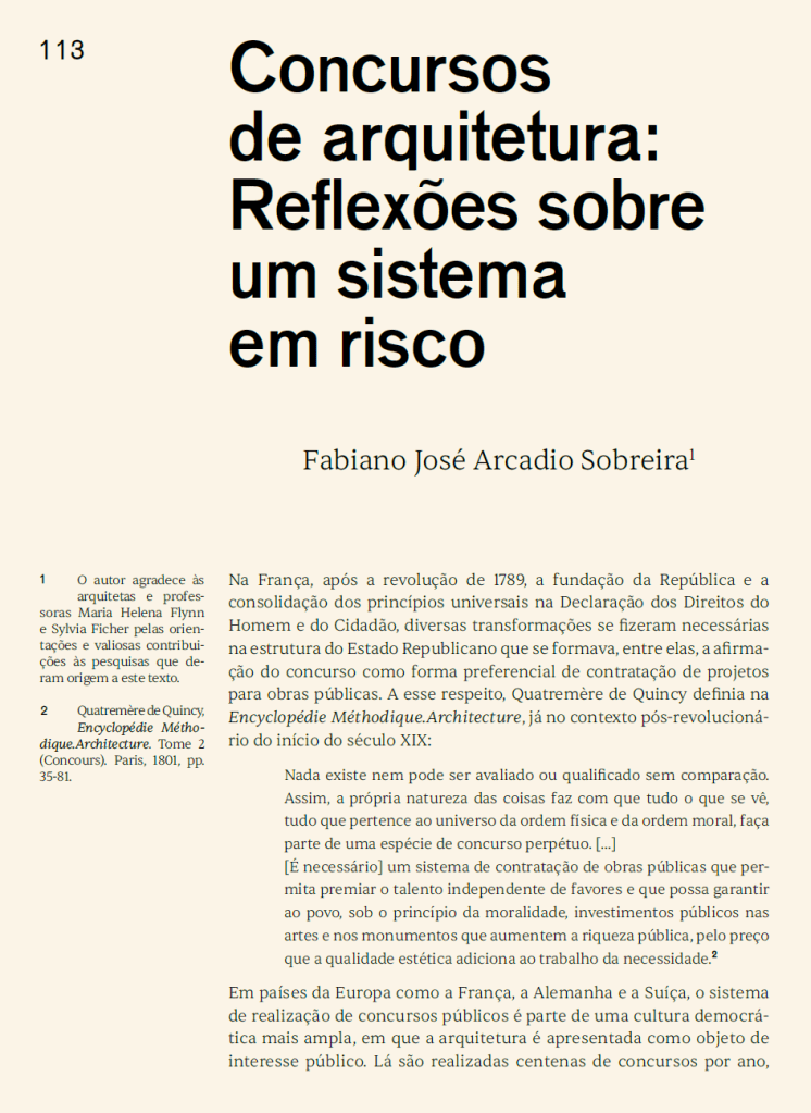 Artigo sobre a relação entre os concursos de arquitetura organizados pelo IAB e a história política do Brasil, publicado no livro IABSP 80 anos. O livro apresenta reflexões sobre a história do Instituto a partir do tempo presente.