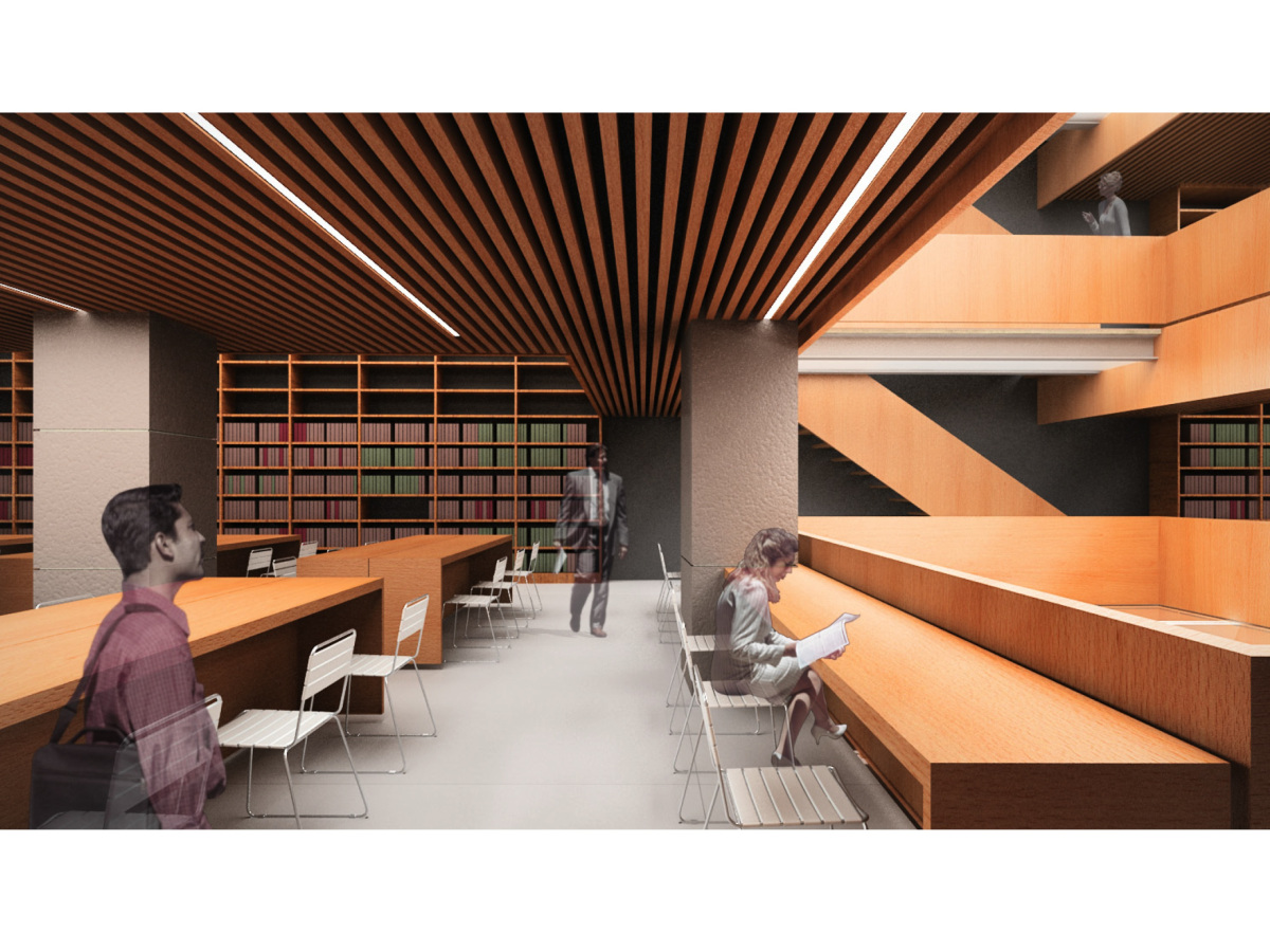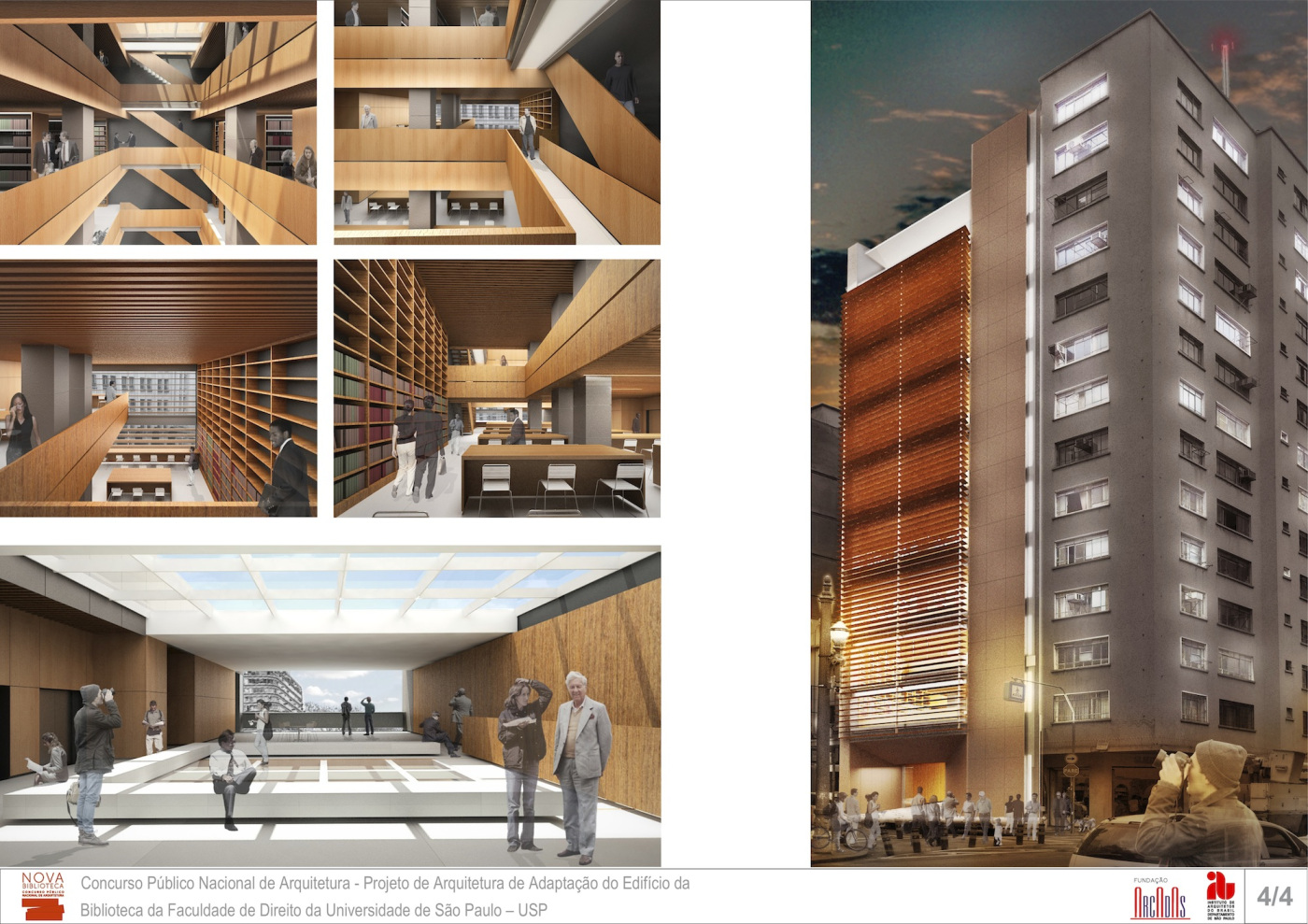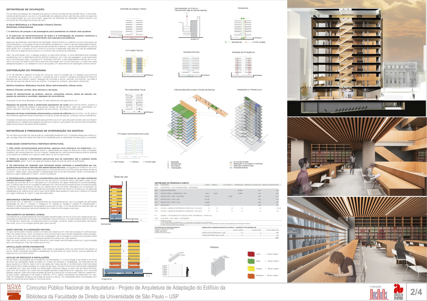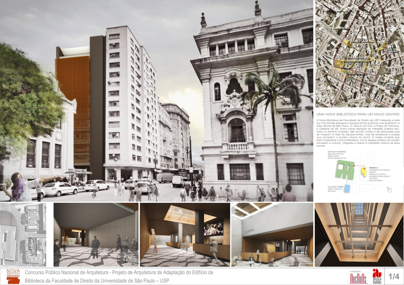 Este projeto considera que a Nova Biblioteca da Faculdade de Direito da USP será um espaço público de caráter educativo e cultural, integrado e aberto à vitalidade urbana da área central. Por se tratar de espaço de interesse educativo e cultural na área central de São Paulo, propõe-se a integração do espaço edificado com a rua, como uma extensão do passeio público, abrindo seu acervo e expondo sua programação ao uso comunitário, seguindo as diretrizes da Operação Urbana Centro e os princípios da Faculdade de Direito da USP. A ocupação proposta para o pavimento térreo visa garantir o máximo de permeabilidade e flexibilidade, buscando atender não apenas as demandas do presente, mas as possibilidades de articulação com a quadra e com o entorno, sem prejuízo à segurança do acervo e o conforto dos usuários da biblioteca. Nesta proposta, o vazio central é mantido e iluminado por cobertura em vidro estruturado em perfis de aço. Além do vazio central, a iluminação natural foi maximizada nas fachadas norte e sul, cuja insolação é controlada por meio de brises de alumínio.