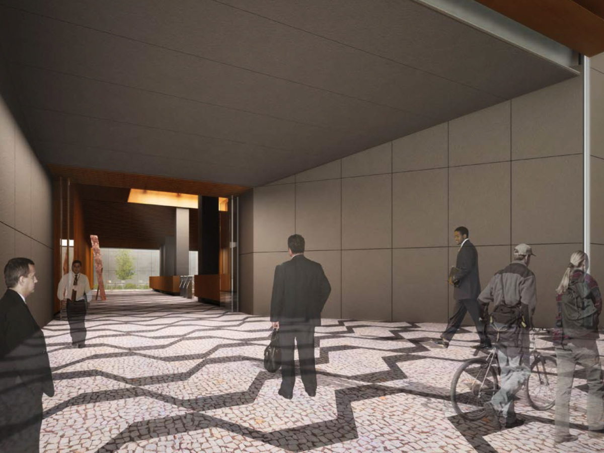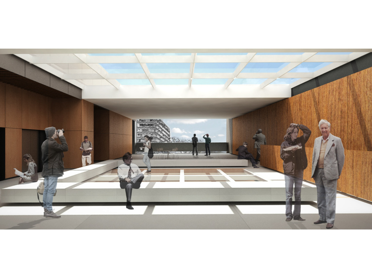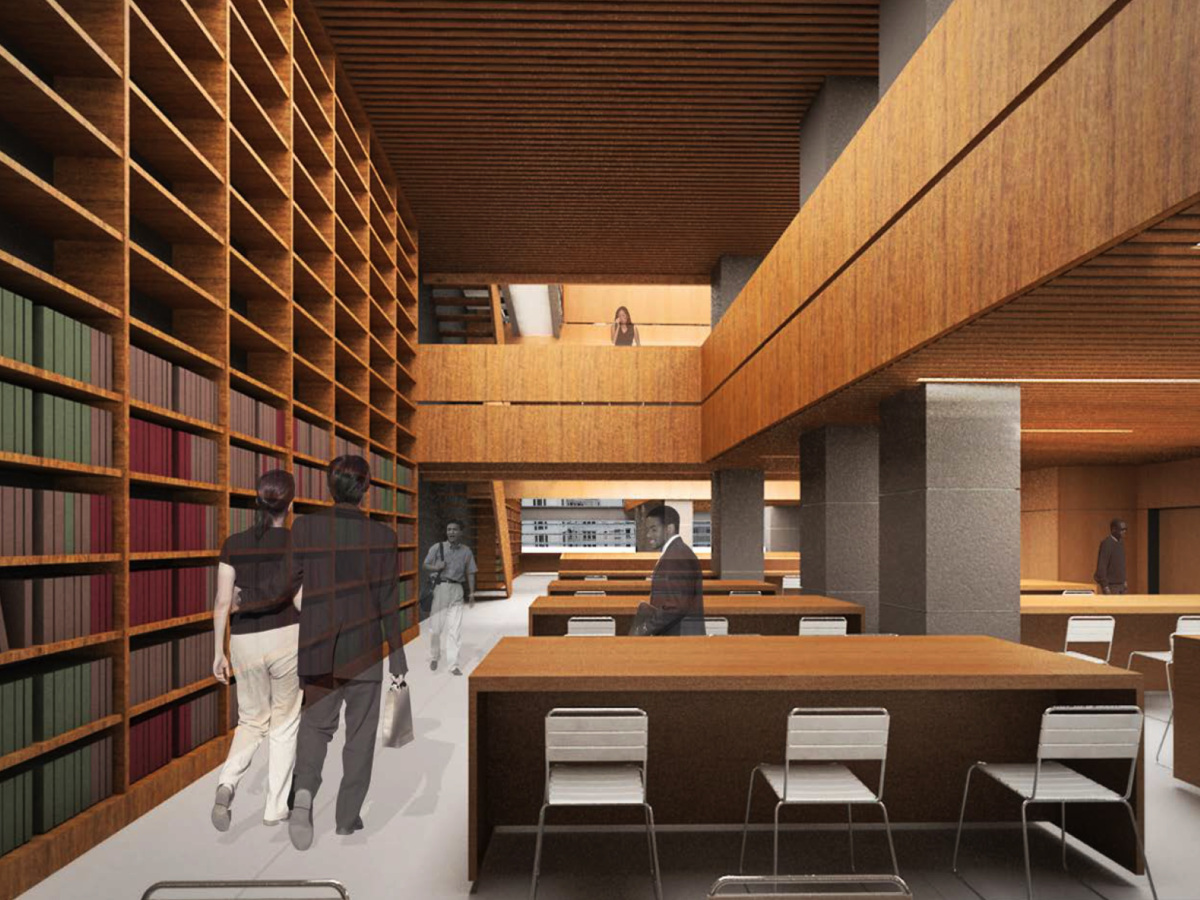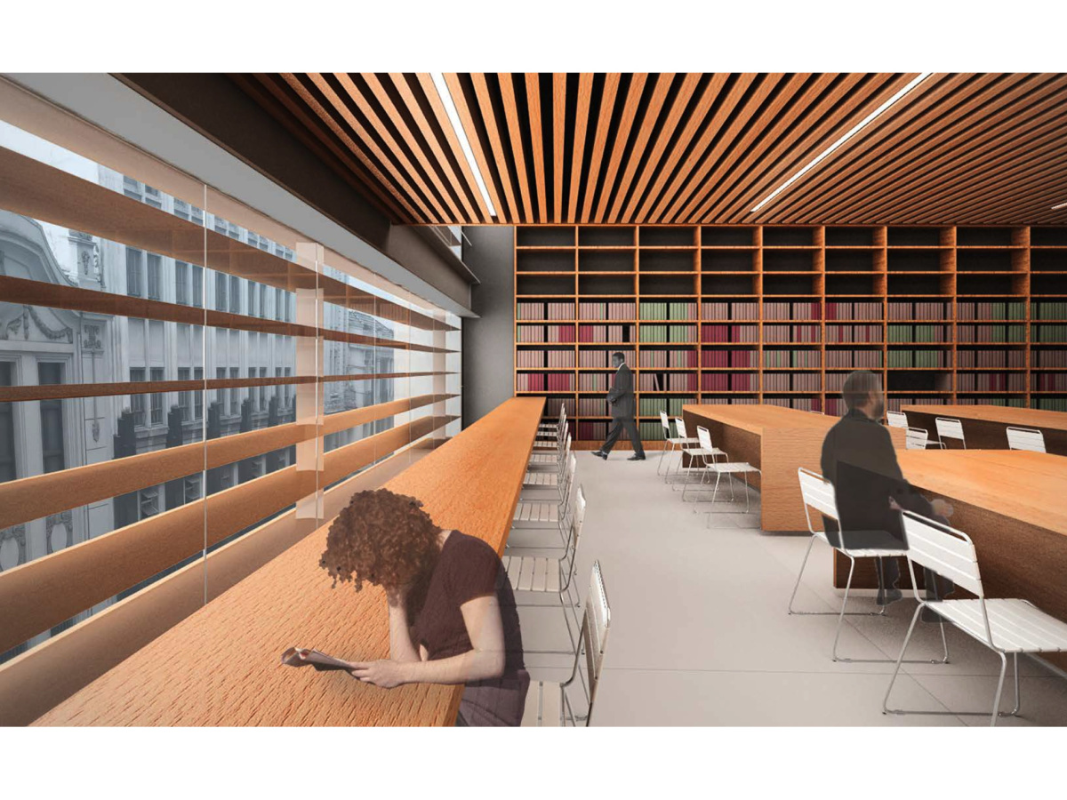 Este projeto considera que a Nova Biblioteca da Faculdade de Direito da USP será um espaço público de caráter educativo e cultural, integrado e aberto à vitalidade urbana da área central. Por se tratar de espaço de interesse educativo e cultural na área central de São Paulo, propõe-se a integração do espaço edificado com a rua, como uma extensão do passeio público, abrindo seu acervo e expondo sua programação ao uso comunitário, seguindo as diretrizes da Operação Urbana Centro e os princípios da Faculdade de Direito da USP. A ocupação proposta para o pavimento térreo visa garantir o máximo de permeabilidade e flexibilidade, buscando atender não apenas as demandas do presente, mas as possibilidades de articulação com a quadra e com o entorno, sem prejuízo à segurança do acervo e o conforto dos usuários da biblioteca. Nesta proposta, o vazio central é mantido e iluminado por cobertura em vidro estruturado em perfis de aço. Além do vazio central, a iluminação natural foi maximizada nas fachadas norte e sul, cuja insolação é controlada por meio de brises de alumínio.