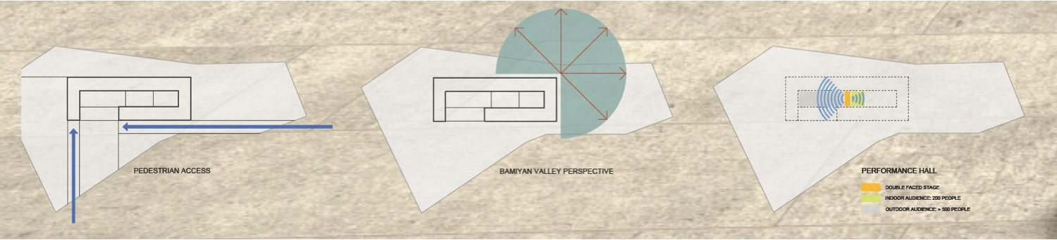 Não se trata apenas de um edifício: o que se propõe é uma plataforma, na qual os espaços externos e internos se integram para a celebração do patrimônio mundial do Vale do Bamiyan. A cobertura é também o chão. A plataforma foi projetada ao mesmo tempo como palco e observatório, onde as pessoas poderão circular, se expressar e observar a beleza e riqueza da cultura de Bamiyan.