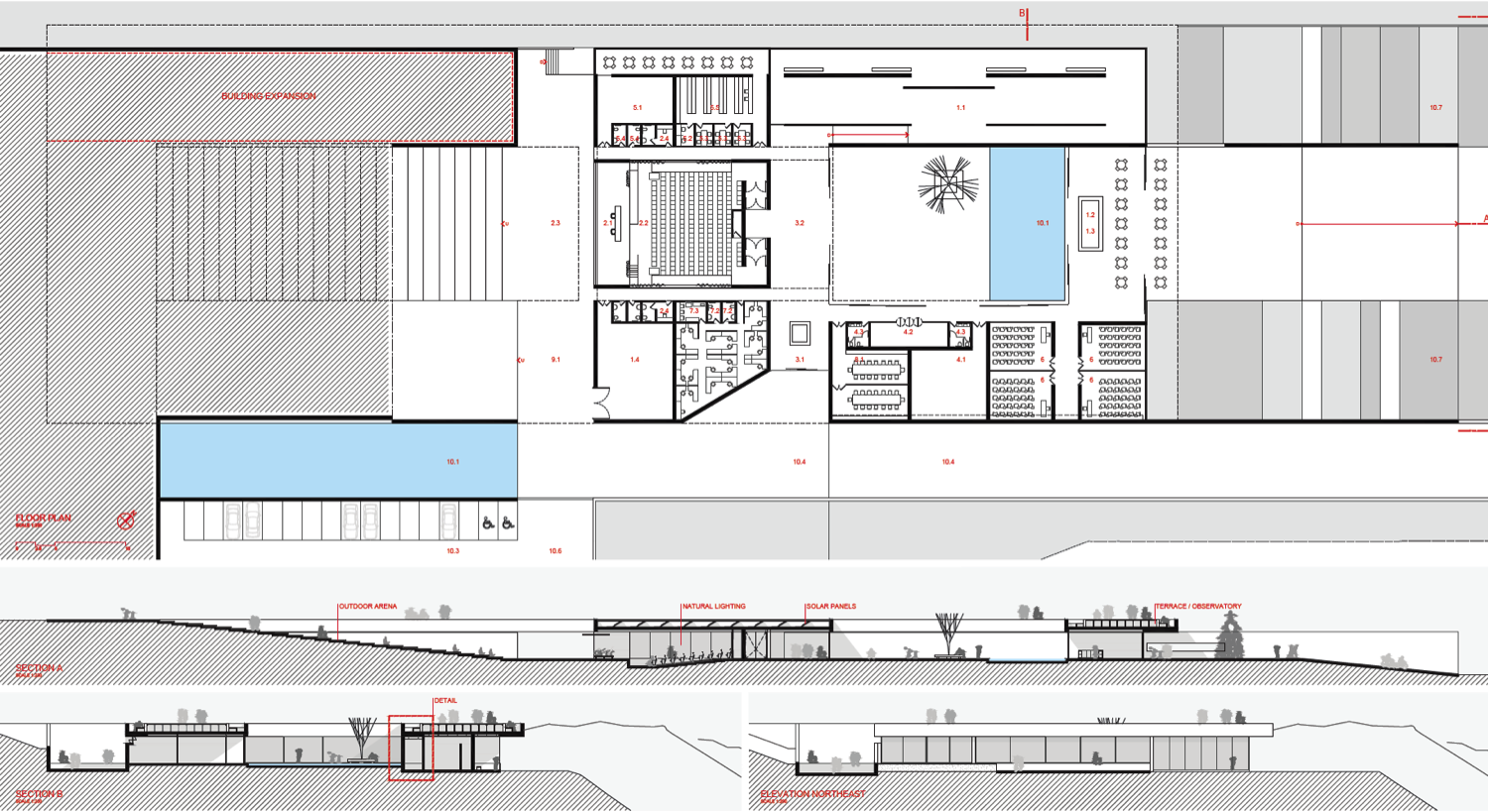No caso de necessidade de ampliação, não serão necessários volumetrias visíveis no terreno. A ampliação poderá ocorrer no mesmo nível do Centro existente, em área reservada para esta finalidade, com vista para o Vale do Bamiyan e sua cobertura estará no mesmo nível do terraço existente. O objetivo é minimizar o impacto visual de eventuais ampliações.