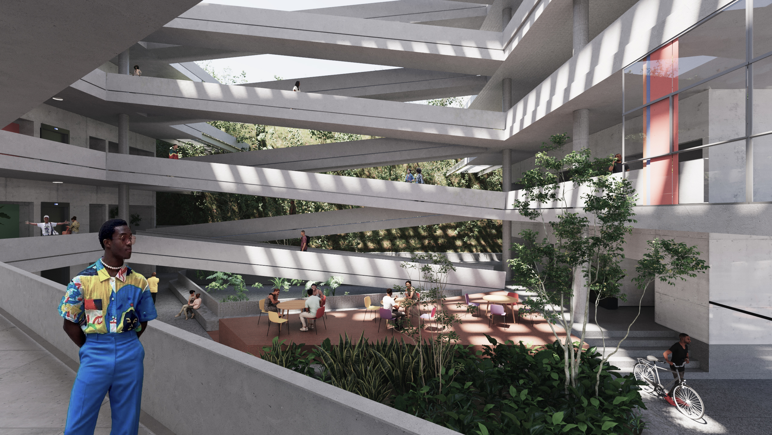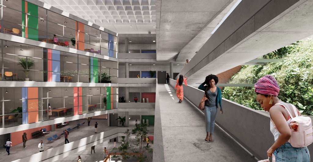 As soluções passivas, que incluem os espaços imersivos com iluminação e ventilação naturais, elementos de alta inércia térmica, integração com os espaços verdes, além da circulação por meio de rampas, contribuem diretamente para a eficiência energética e a sustentabilidade do projeto.
