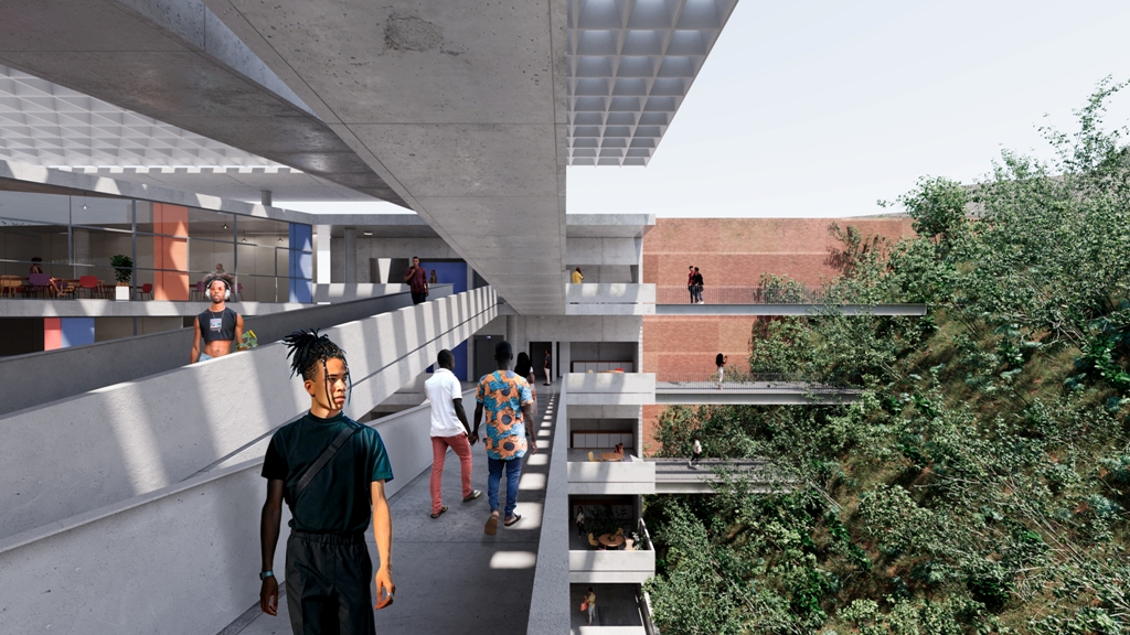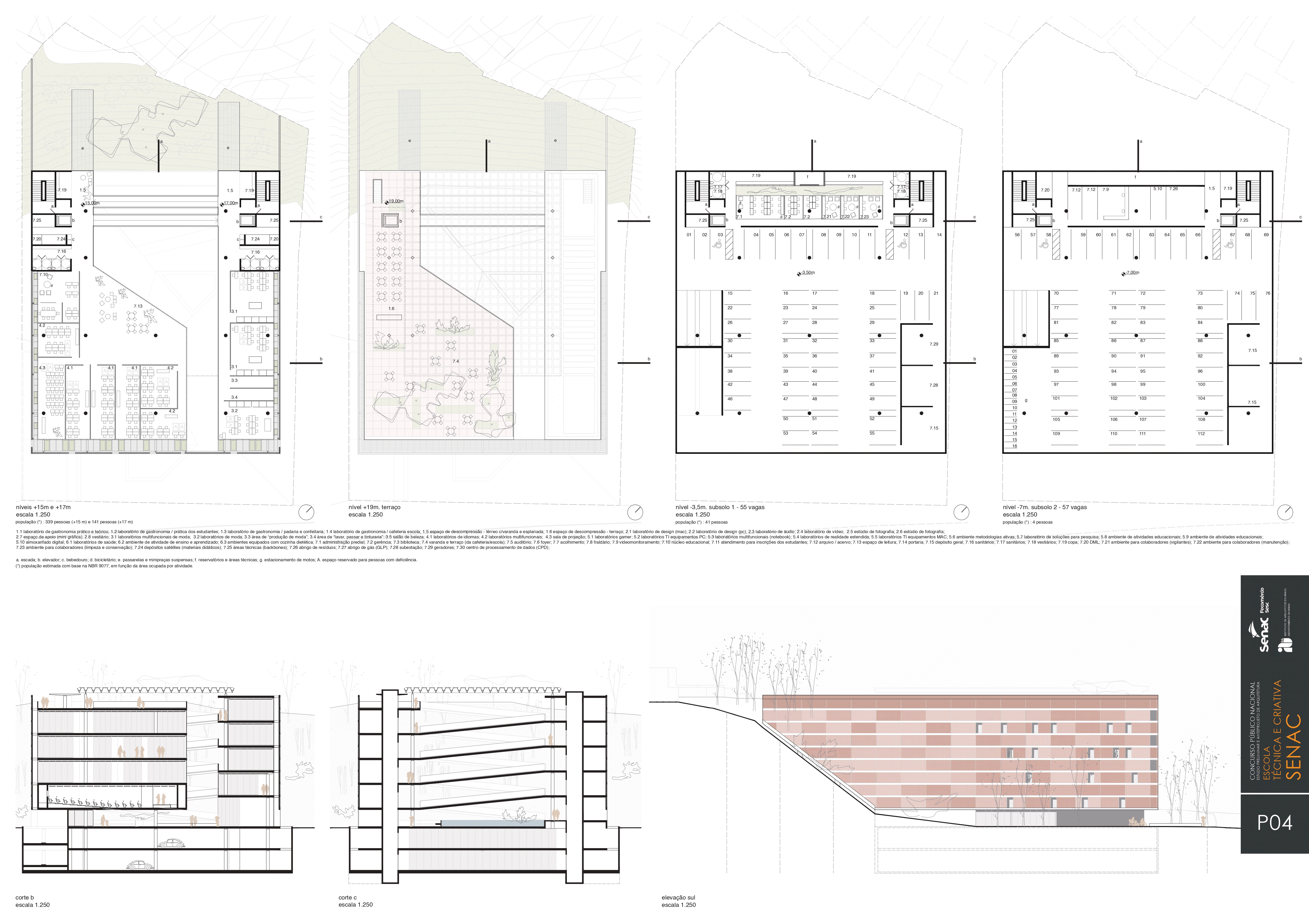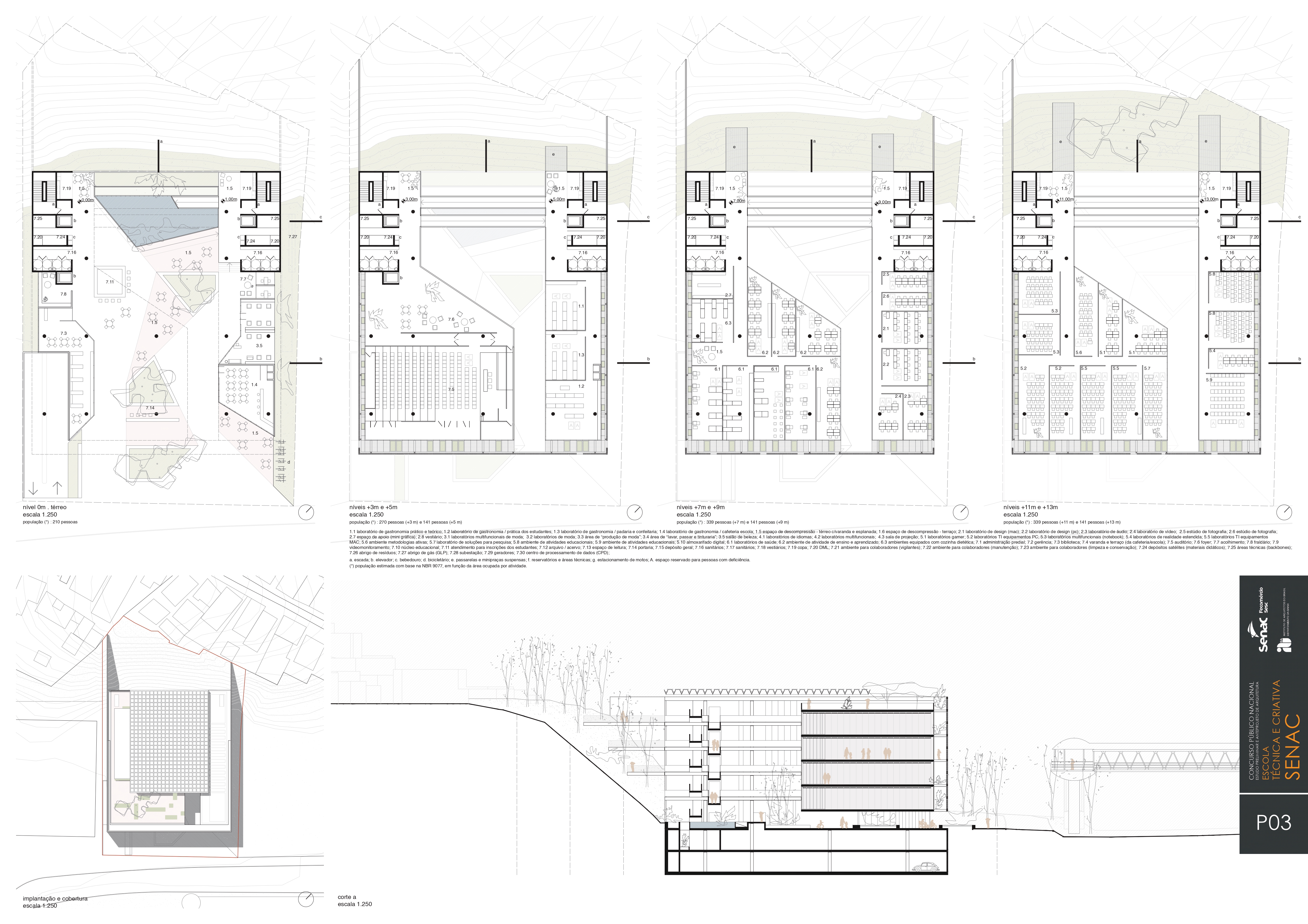 A circulação fluida, conectada aos espaços de convivência, é uma premissa do projeto. Para esse fim, o programa é distribuído em semi níveis, acessados por meio de rampas integradas aos espaços verdes do talude, patamares de convivência, passarelas e praças suspensas.