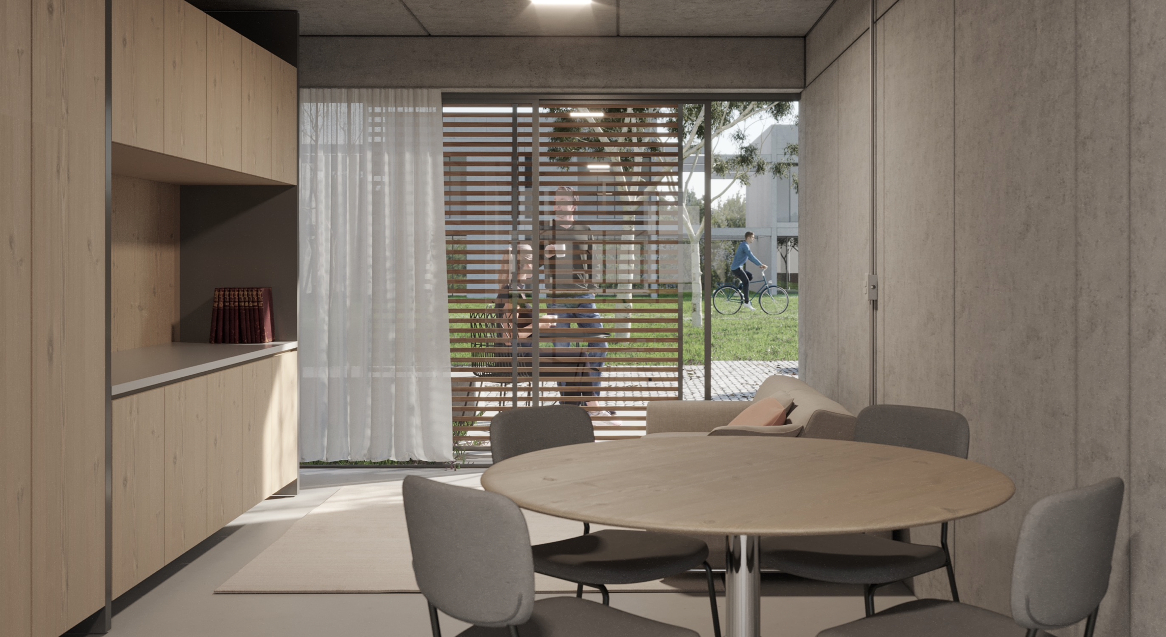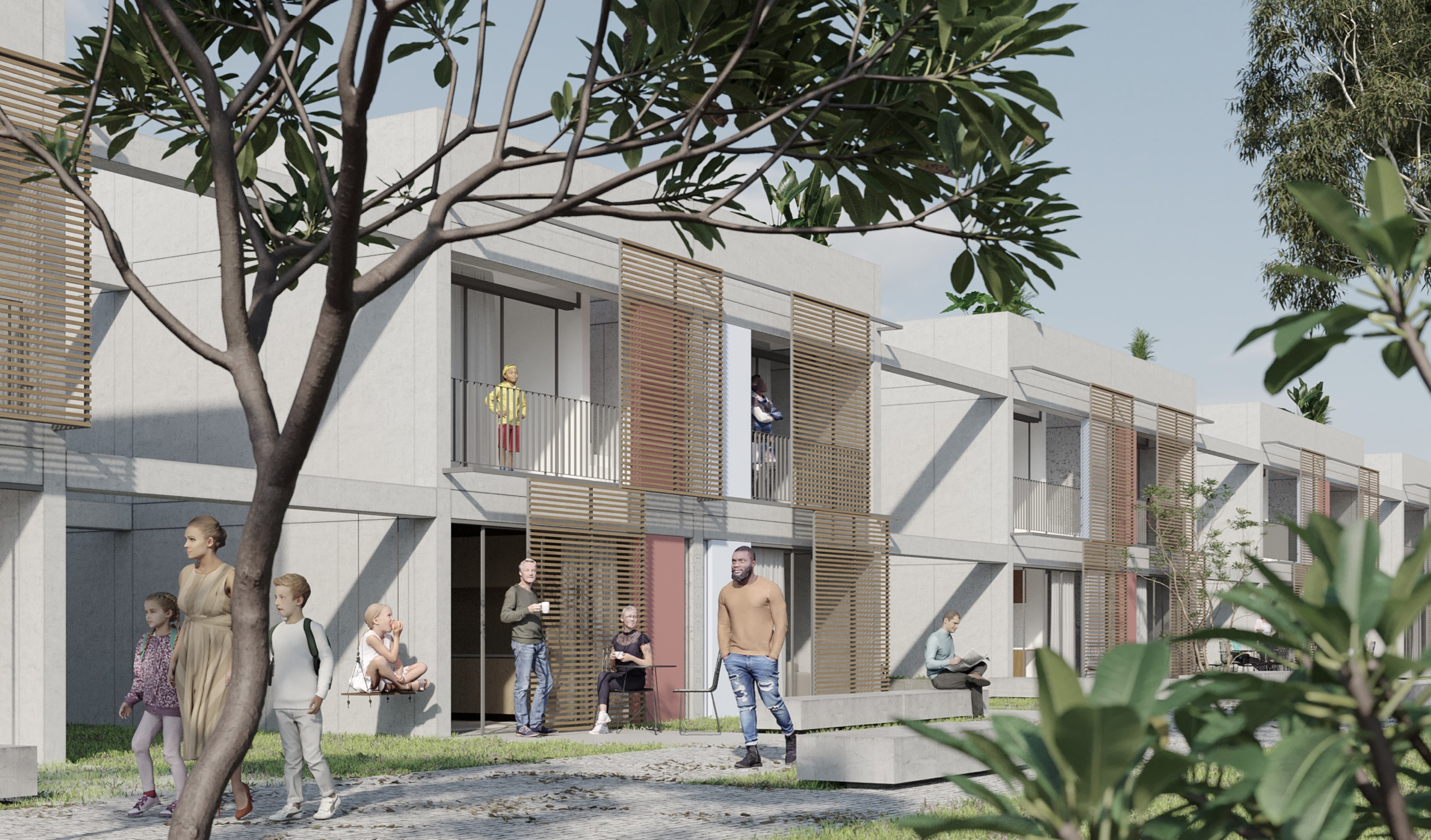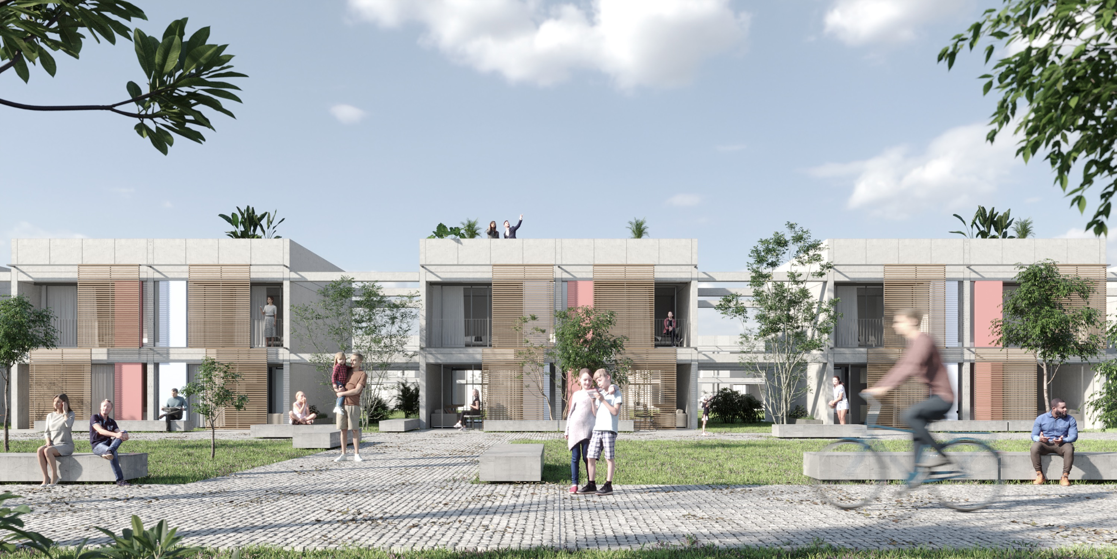 as unidades (área útil inicial de aproximadamente 65 m2) são expansíveis (ampliações de até 40 m2) e adaptáveis, conforme a necessidade. os ambientes de estar, jantar, cozinha e serviços são integrados, a fim de otimizar os espaços, promover a inclusão e reduzir as hierarquias sociais e de gênero. propõe-se o conceito de “cobertura ativa”, com placas fotovoltaicas, coletores solares, coleta de águas pluviais, e terraço multiuso (solário, horta, etc).
