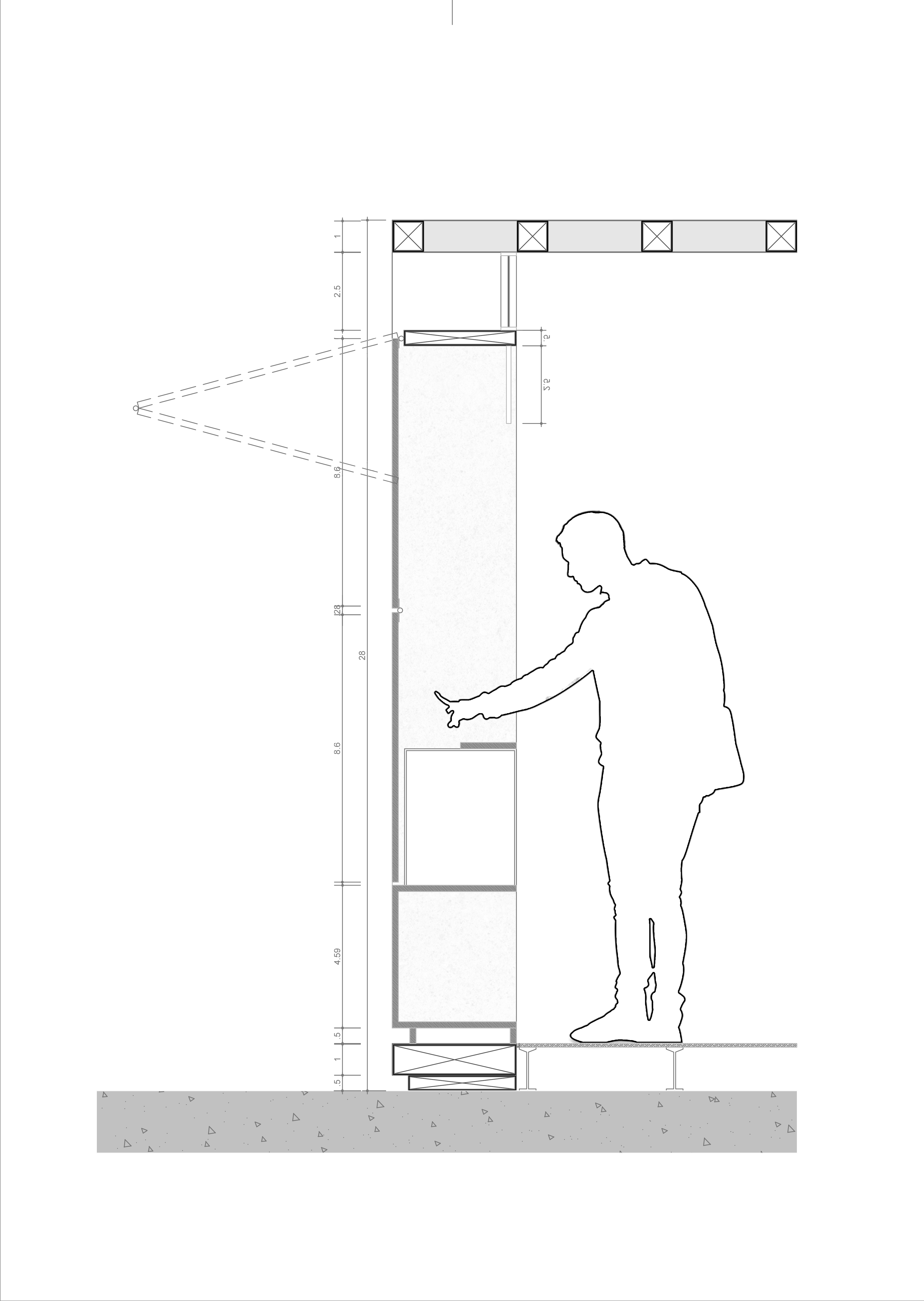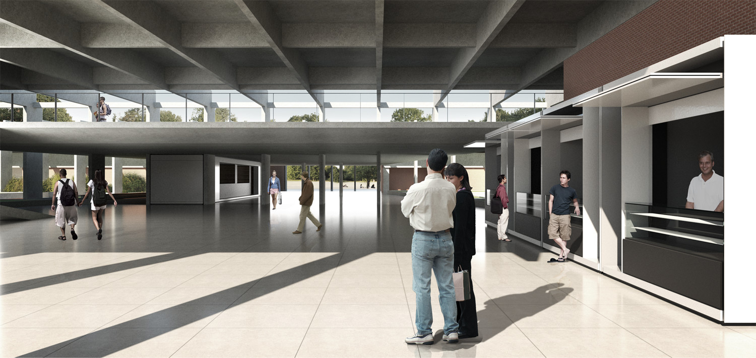 A partir da compreensão do traçado que define o Instituto Central de Ciências, principal edifício da Universidade de Brasília, a proposta busca se inserir à estrutura existente, respeitando sua espacialidade e caráter. O ICC possui dois acessos principais resultantes de dois eixos: um longitudinal, que distribui as pessoas que circulam pelo edifício, e um transversal que determina a entrada e cria uma ligação entre estacionamento e a praça maior. Ambos os eixos são fundamentais não apenas para a circulação dentro do pavilhão, mas para a articulação de todo o Campus Darcy Ribeiro. O cruzamento desses fluxos conformam duas praças, “Ala Sul” e “Ala Norte” onde é possível contemplar a perspectiva gerada pela repetição estrutural do edifício, assim como a paisagem que varre o Campus até o Lago. A altura reduzida da laje nesses pontos compreendem uma mudança de escala dentro do edifício, que deixa de ser monumental e adquire um caráter cotidiano. Essas praças configuram espaços significativos de encontro. Não à toa o comércio se instalou ali.