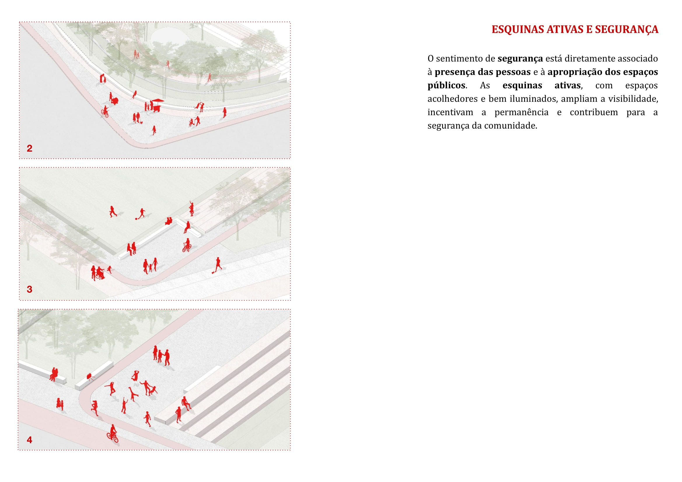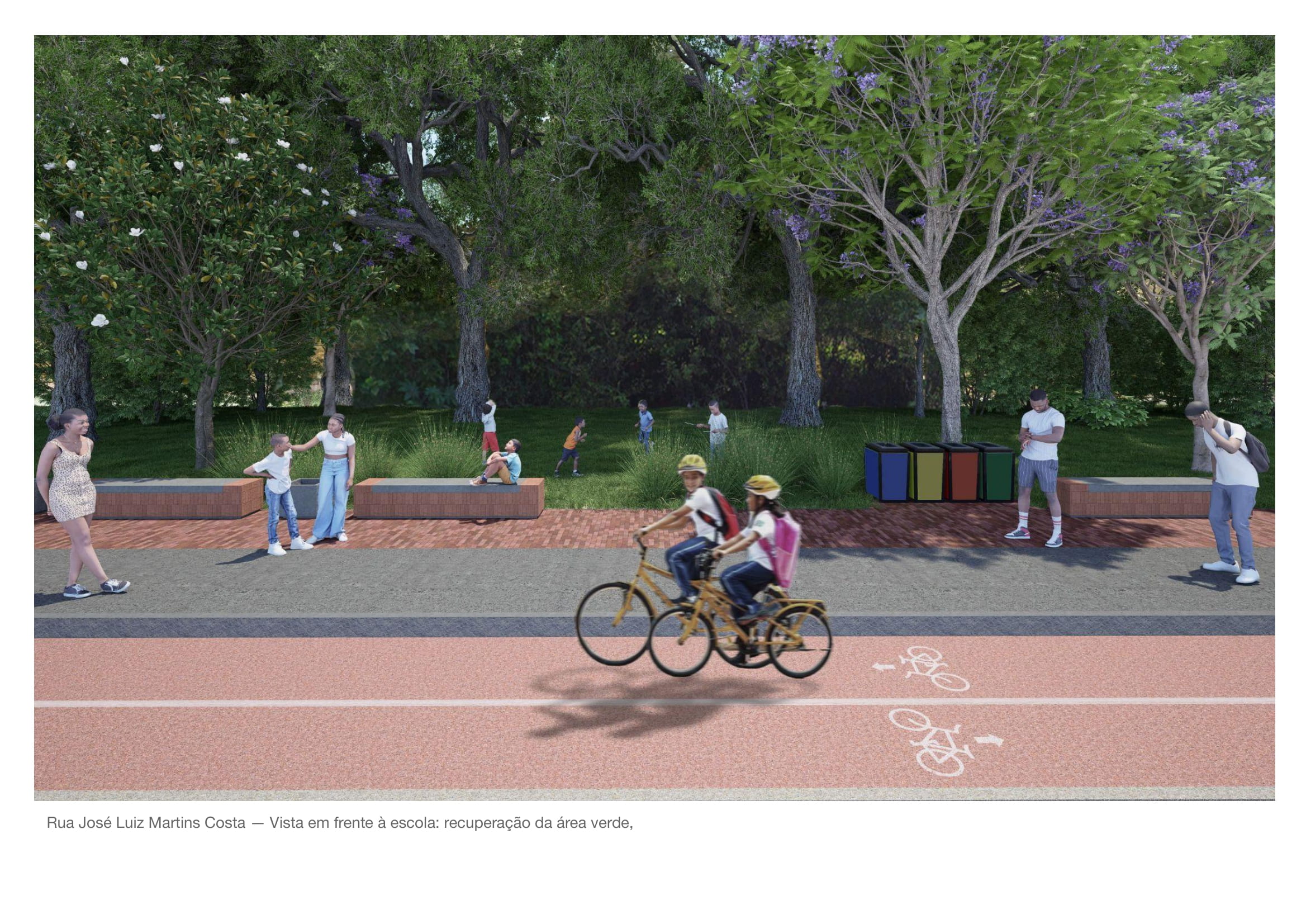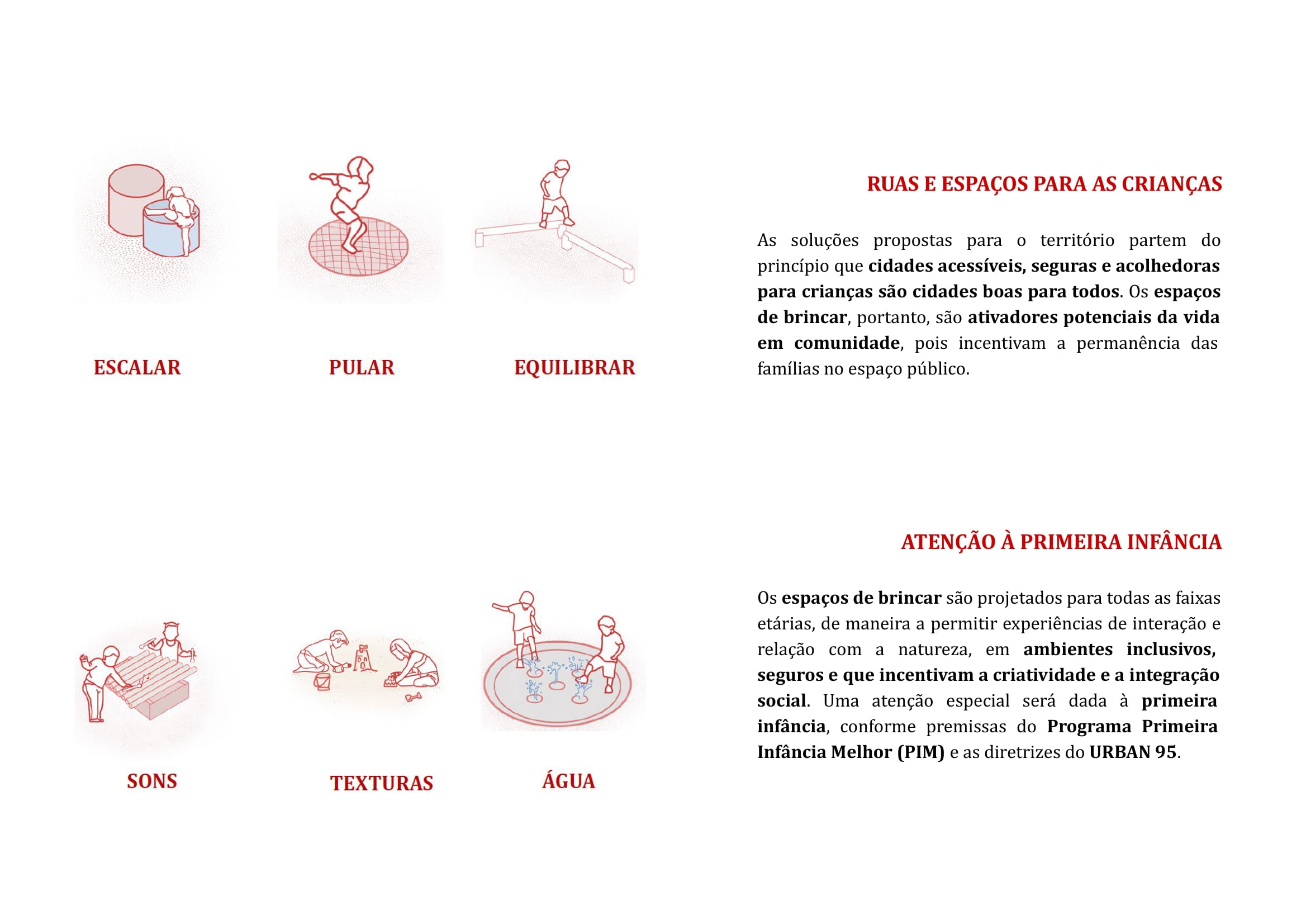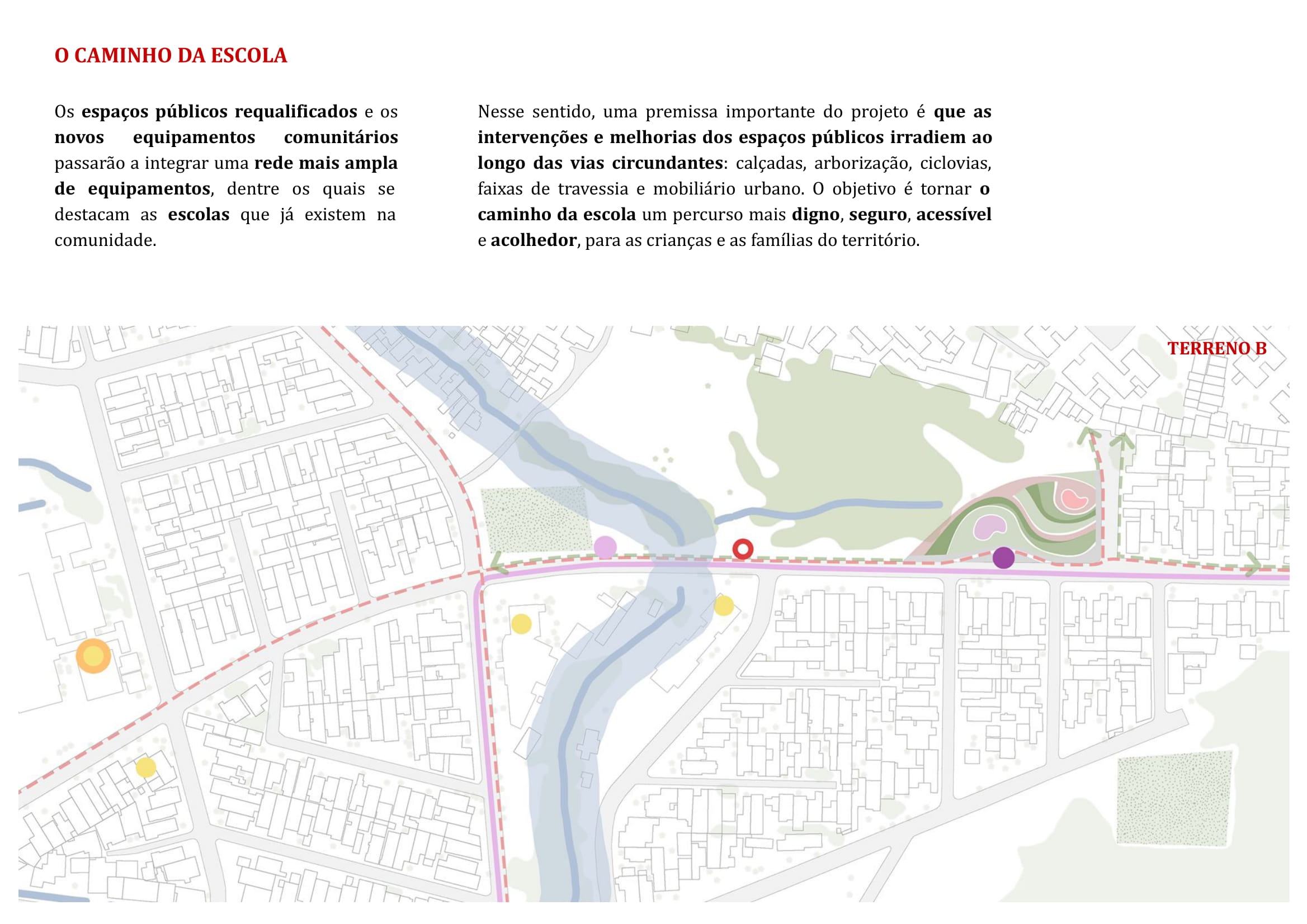 Uma premissa importante do projeto é que as intervenções e melhorias dos espaços públicos irradiem ao longo das vias circundantes: calçadas, arborização, ciclovias, faixas de travessia e mobiliário urbano. O objetivo é tornar o caminho da escola um percurso mais digno, seguro, acessível e acolhedor, para as crianças e as famílias do território. As intervenções propostas partem do reconhecimento das preexistências, em especial a condição da topografia, a arborização de grande porte já existente e as atividades praticadas em cada local. A partir daí os espaços são requalificados e novos equipamentos são propostos, como é o caso dos espaços de brincar, elementos essenciais para a vitalidade dos espaços públicos. As soluções propostas para o território partem do princípio que cidades acessíveis, seguras e acolhedoras para crianças são cidades boas para todos. Os espaços de brincar, portanto, são ativadores potenciais da vida em comunidade, pois incentivam a permanência das famílias no espaço público.