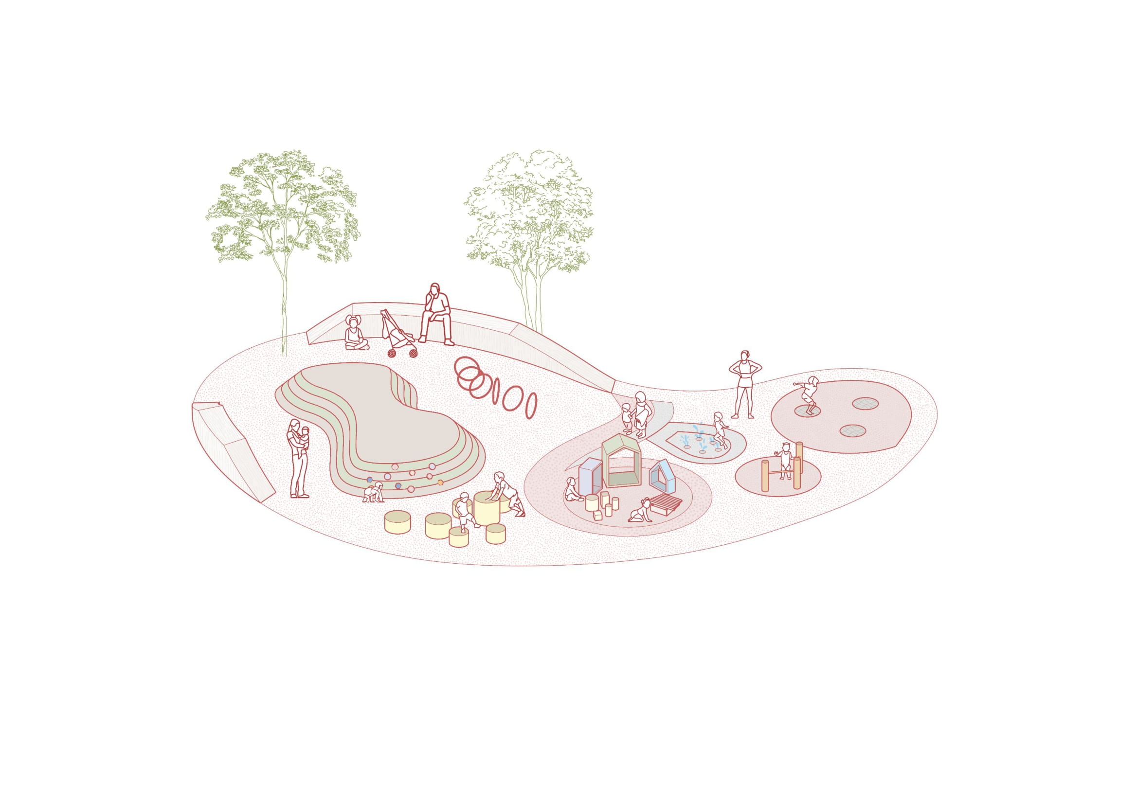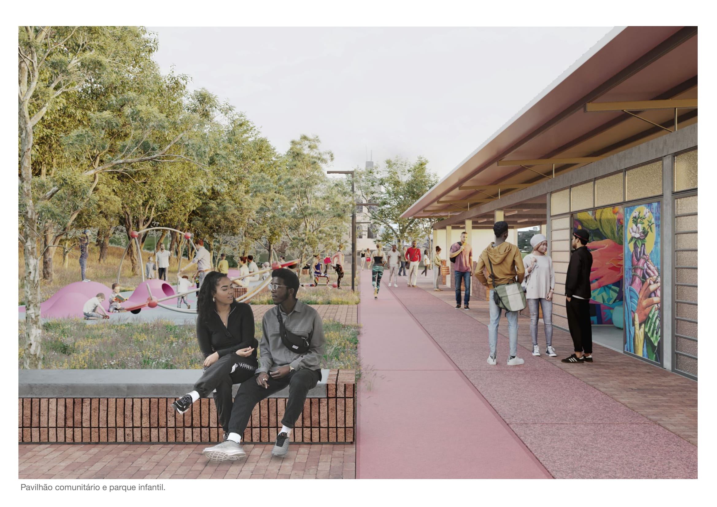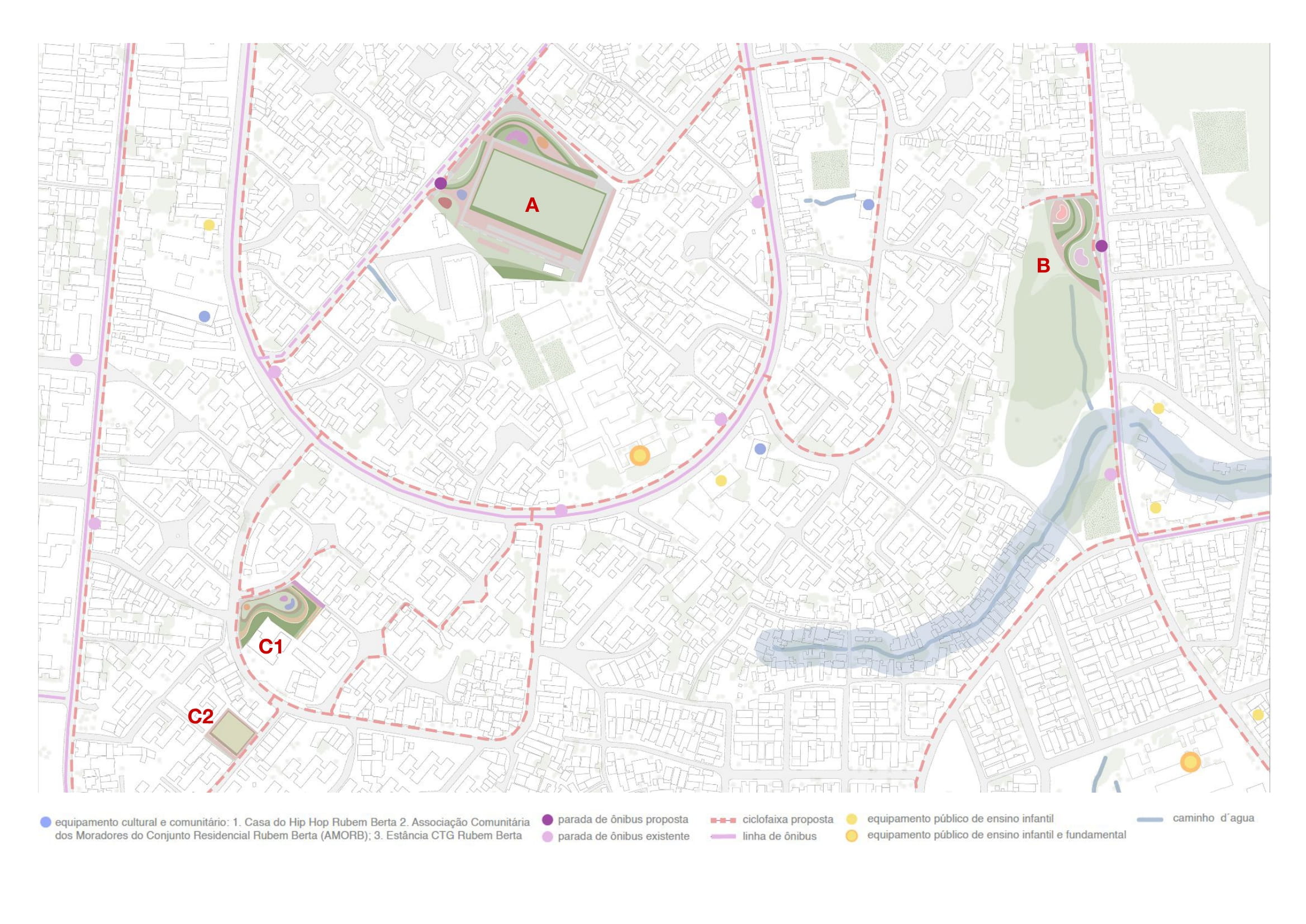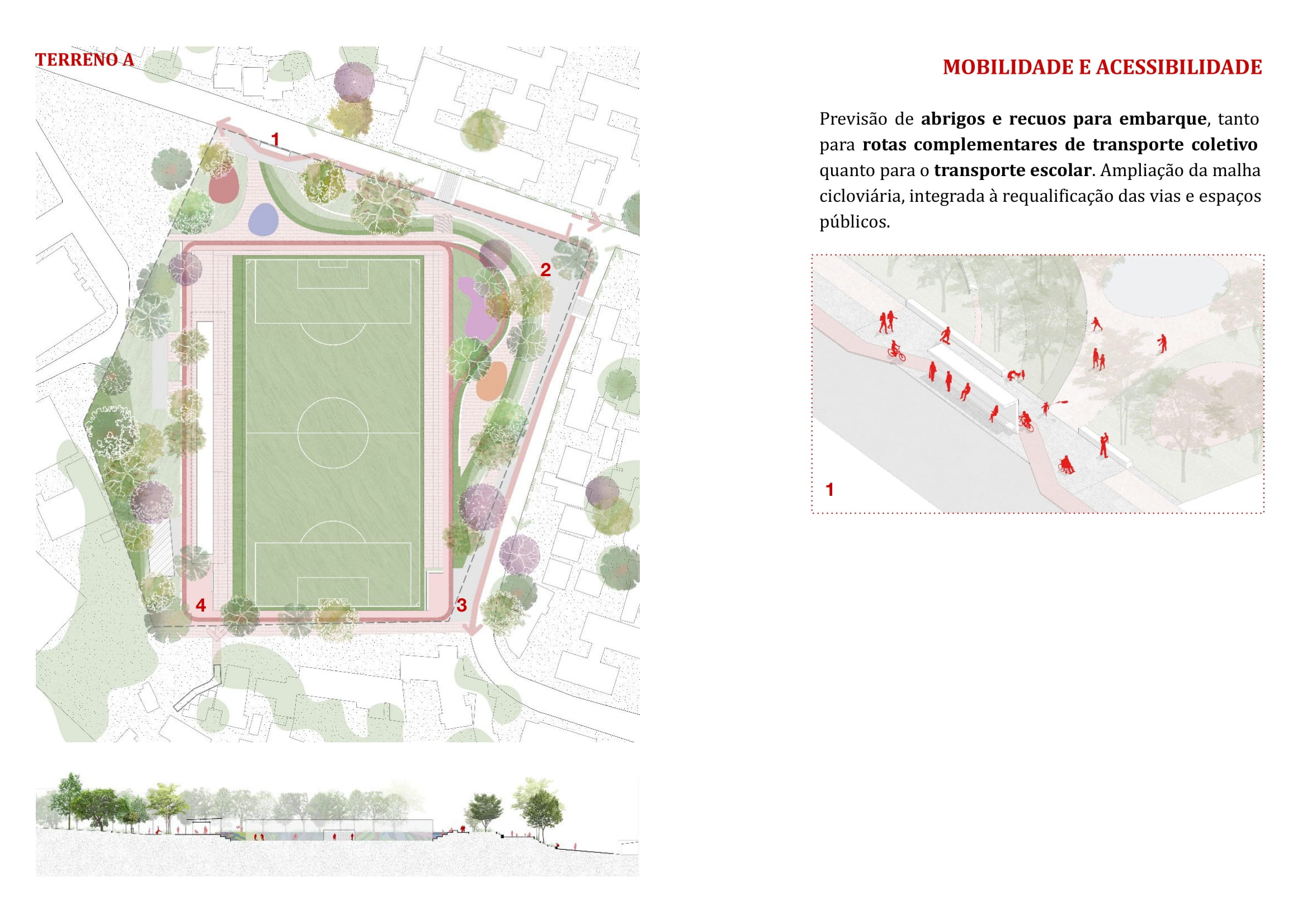Uma premissa importante do projeto é que as intervenções e melhorias dos espaços públicos irradiem ao longo das vias circundantes: calçadas, arborização, ciclovias, faixas de travessia e mobiliário urbano. O objetivo é tornar o caminho da escola um percurso mais digno, seguro, acessível e acolhedor, para as crianças e as famílias do território. As intervenções propostas partem do reconhecimento das preexistências, em especial a condição da topografia, a arborização de grande porte já existente e as atividades praticadas em cada local. A partir daí os espaços são requalificados e novos equipamentos são propostos, como é o caso dos espaços de brincar, elementos essenciais para a vitalidade dos espaços públicos. As soluções propostas para o território partem do princípio que cidades acessíveis, seguras e acolhedoras para crianças são cidades boas para todos. Os espaços de brincar, portanto, são ativadores potenciais da vida em comunidade, pois incentivam a permanência das famílias no espaço público.