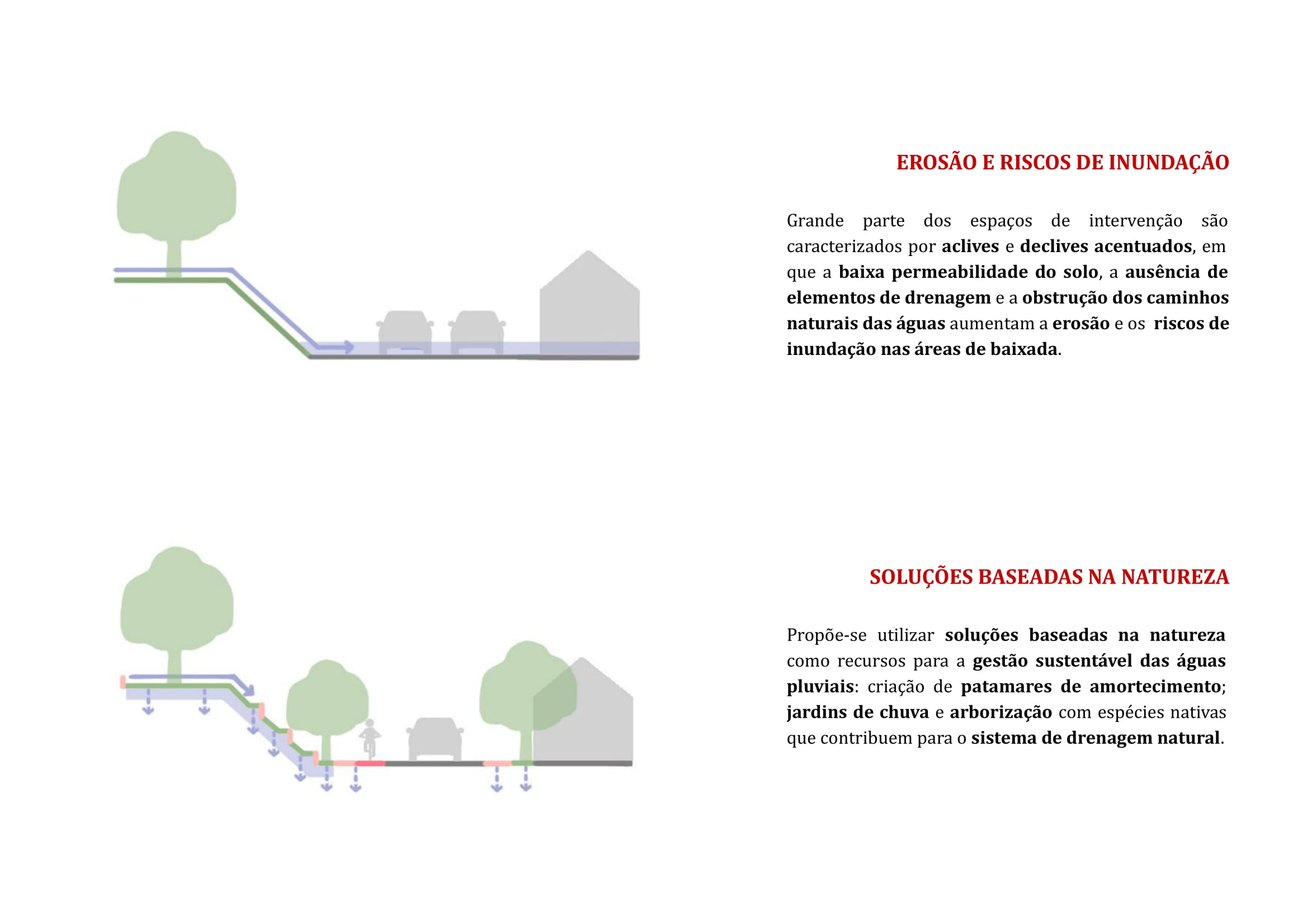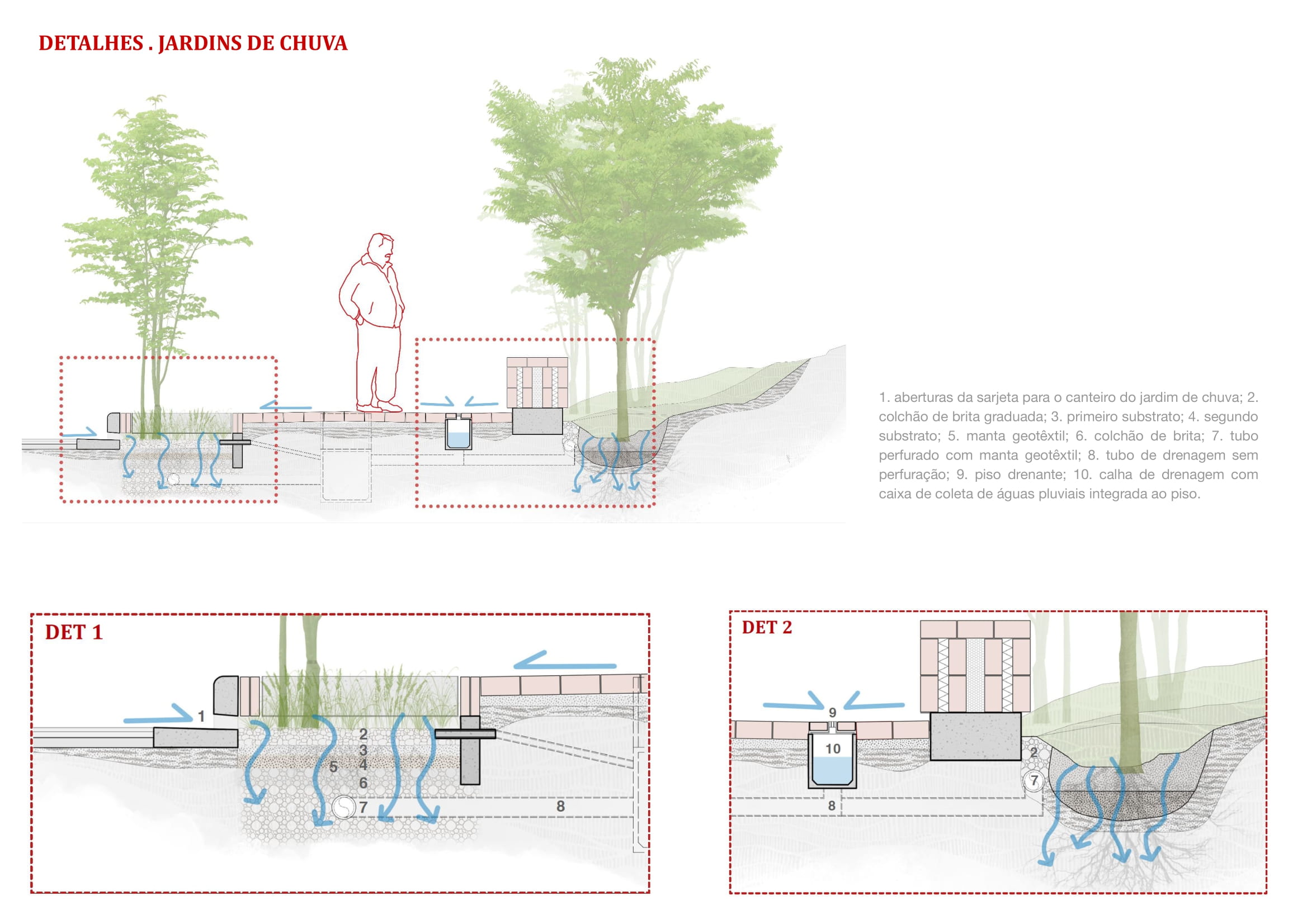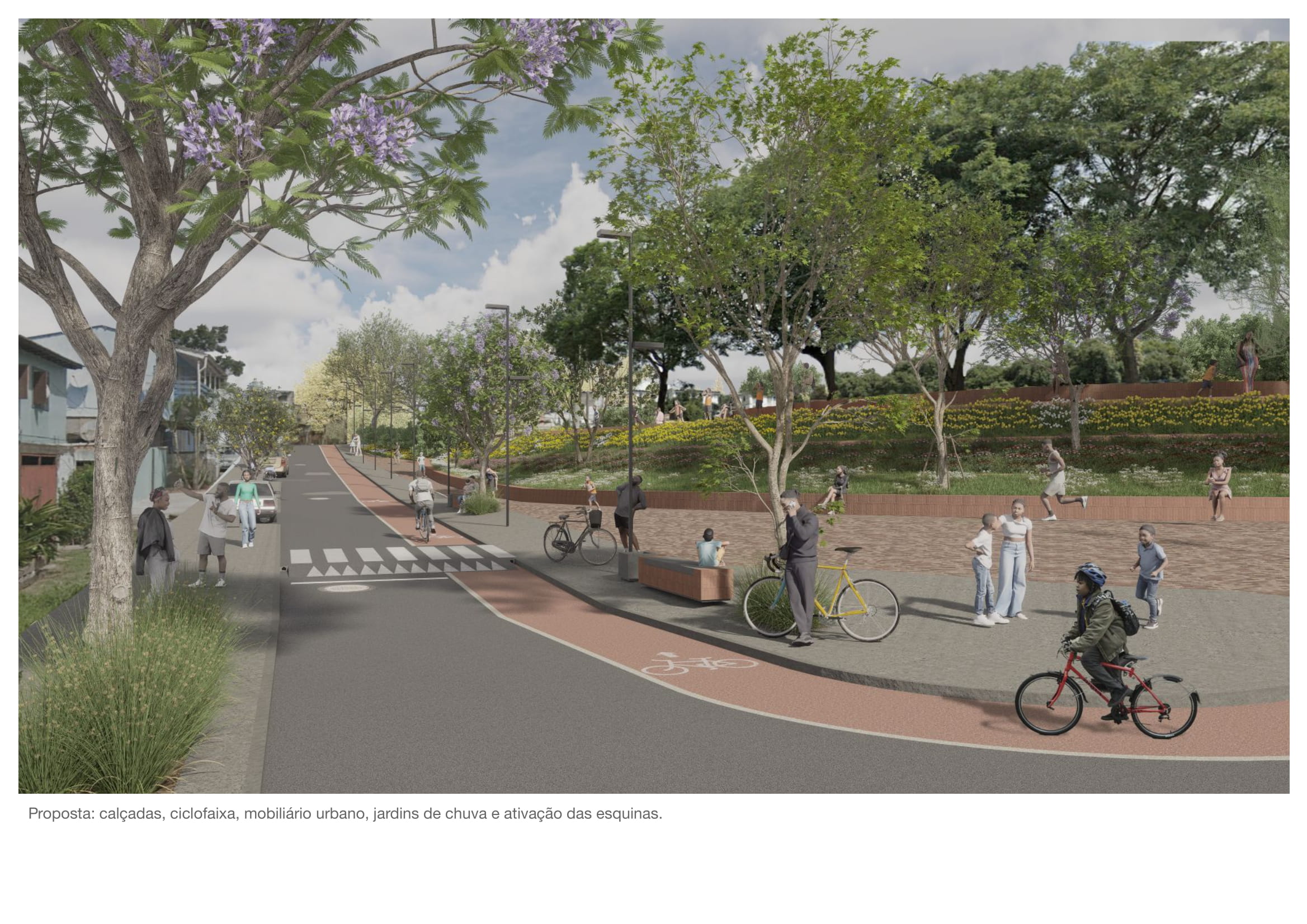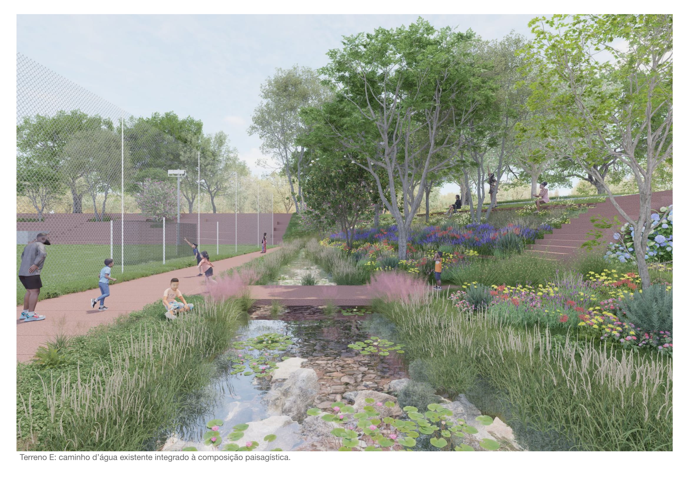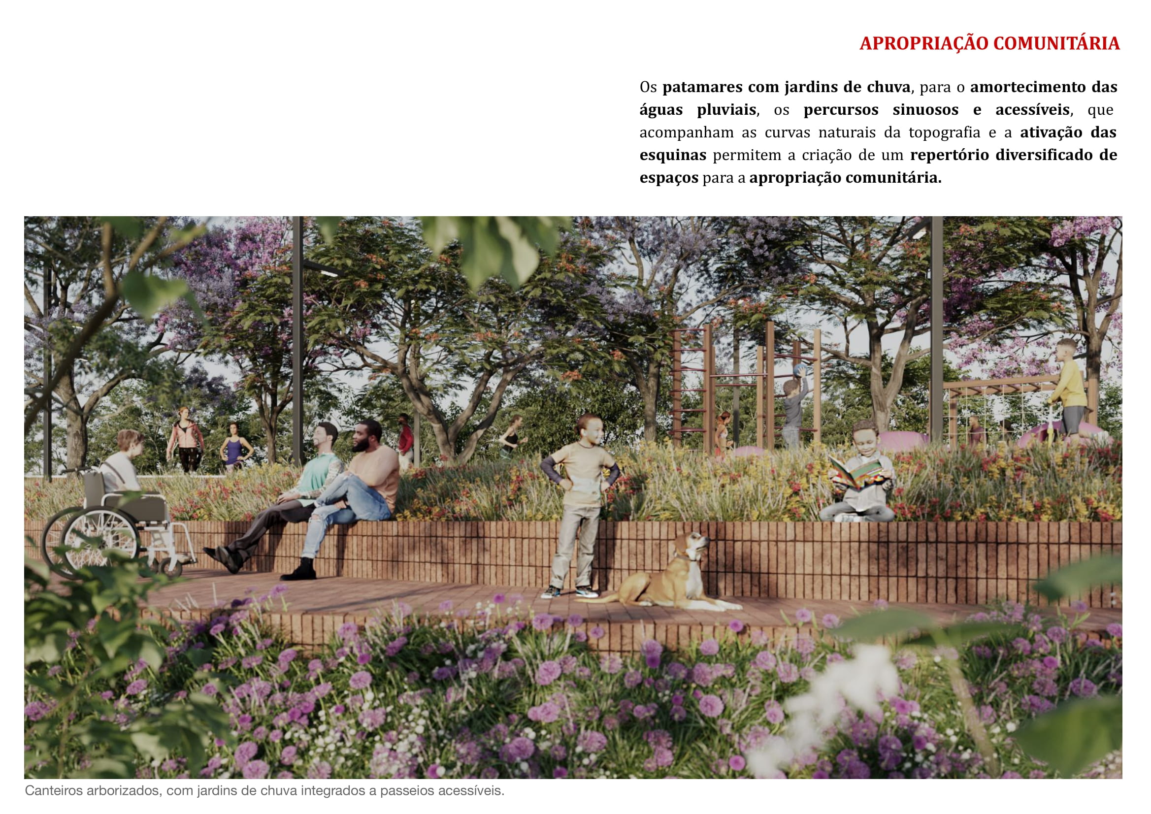 Propõe-se utilizar soluções baseadas na natureza como recursos para a gestão sustentável das águas pluviais: criação de patamares de amortecimento; jardins de chuva e arborização com espécies nativas que contribuem para o sistema de drenagem natural. Os patamares com jardins de chuva, para o amortecimento das águas pluviais, os percursos sinuosos e acessíveis, que acompanham as curvas naturais da topografia e a ativação das esquinas permitem a criação de um repertório diversificado de espaços para a apropriação comunitária.