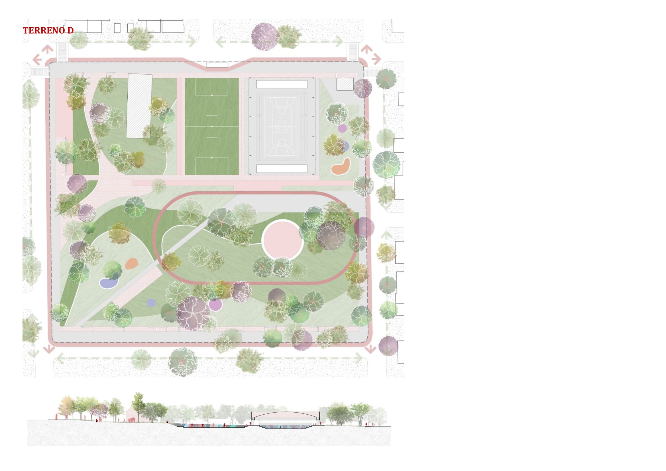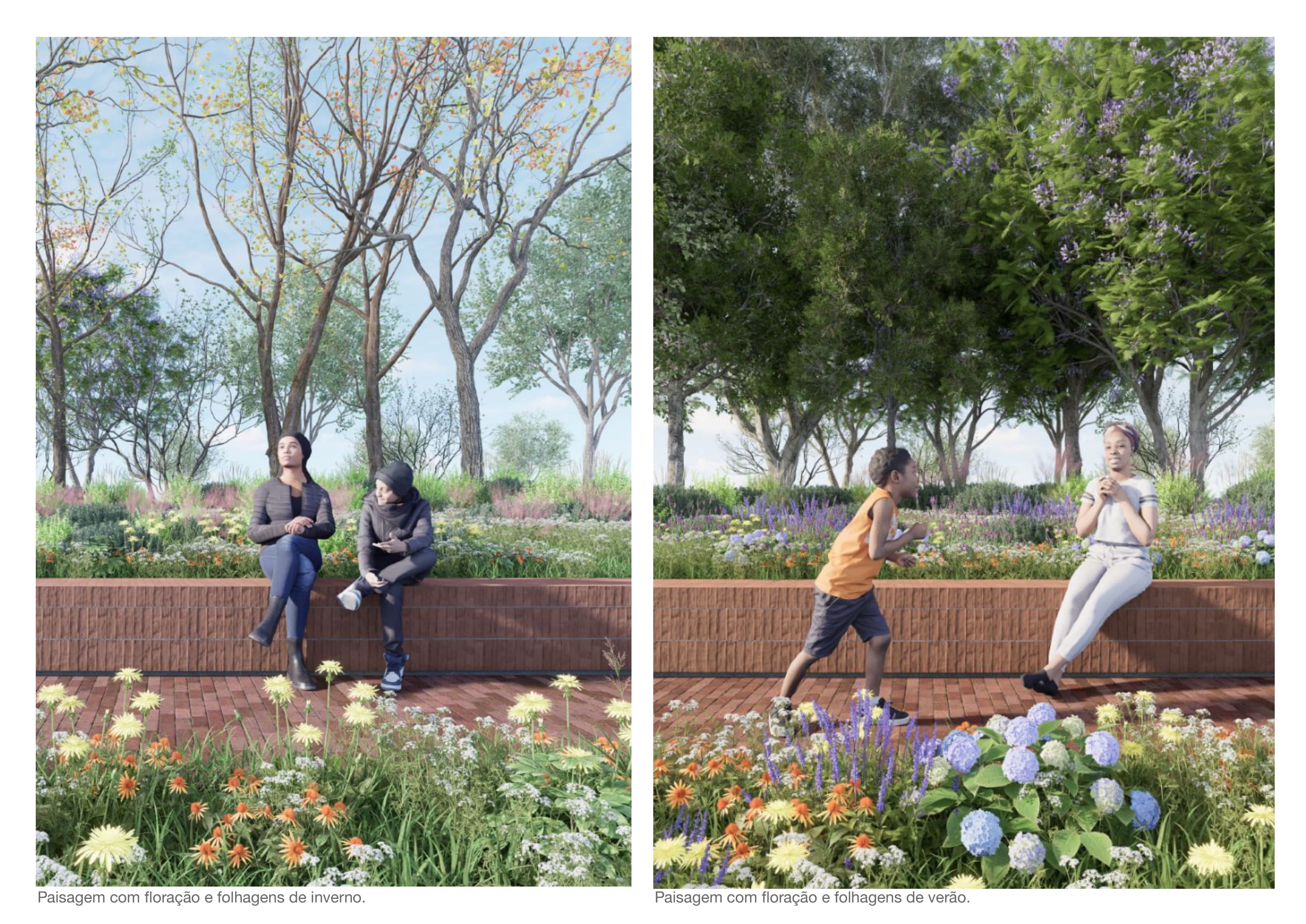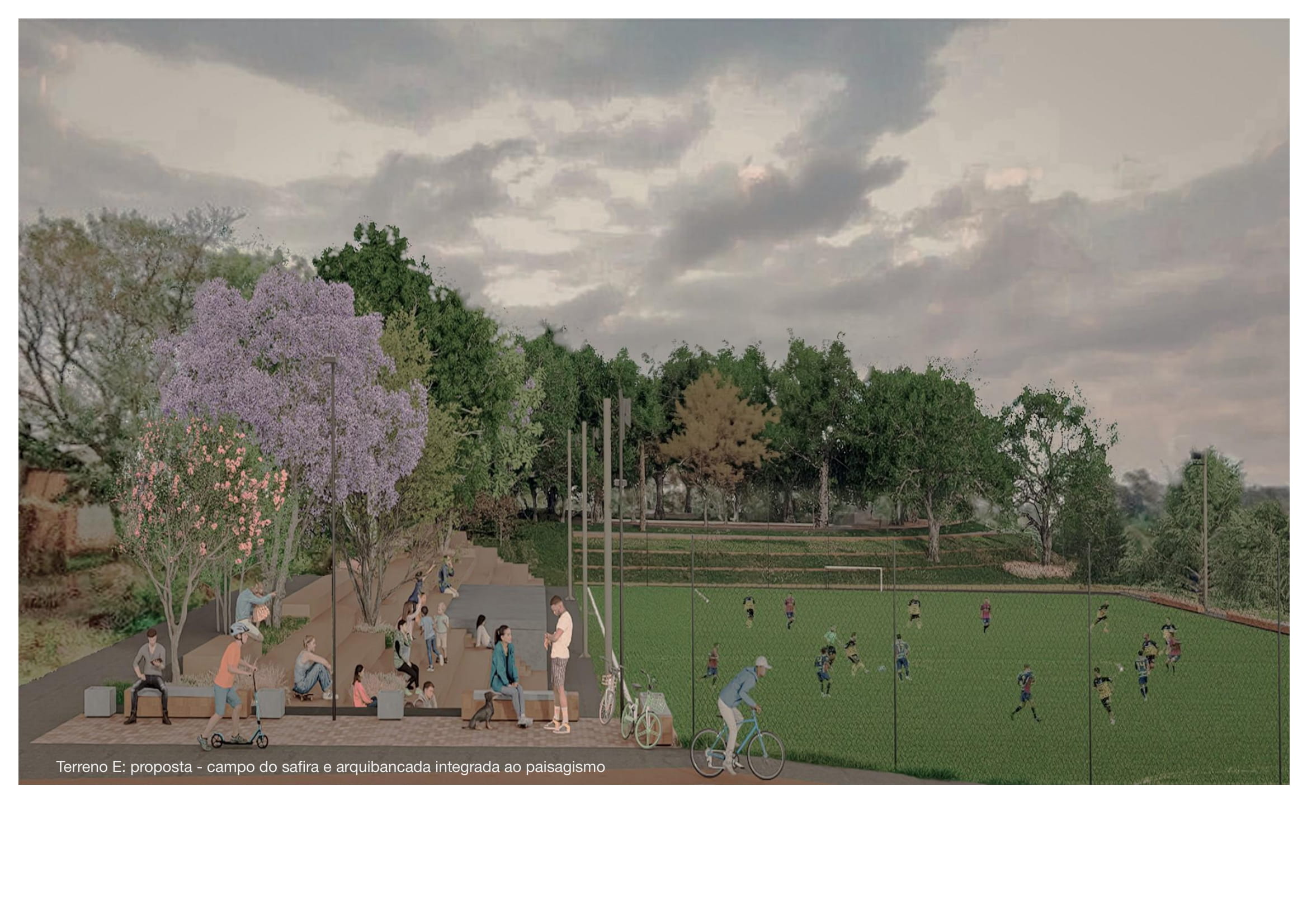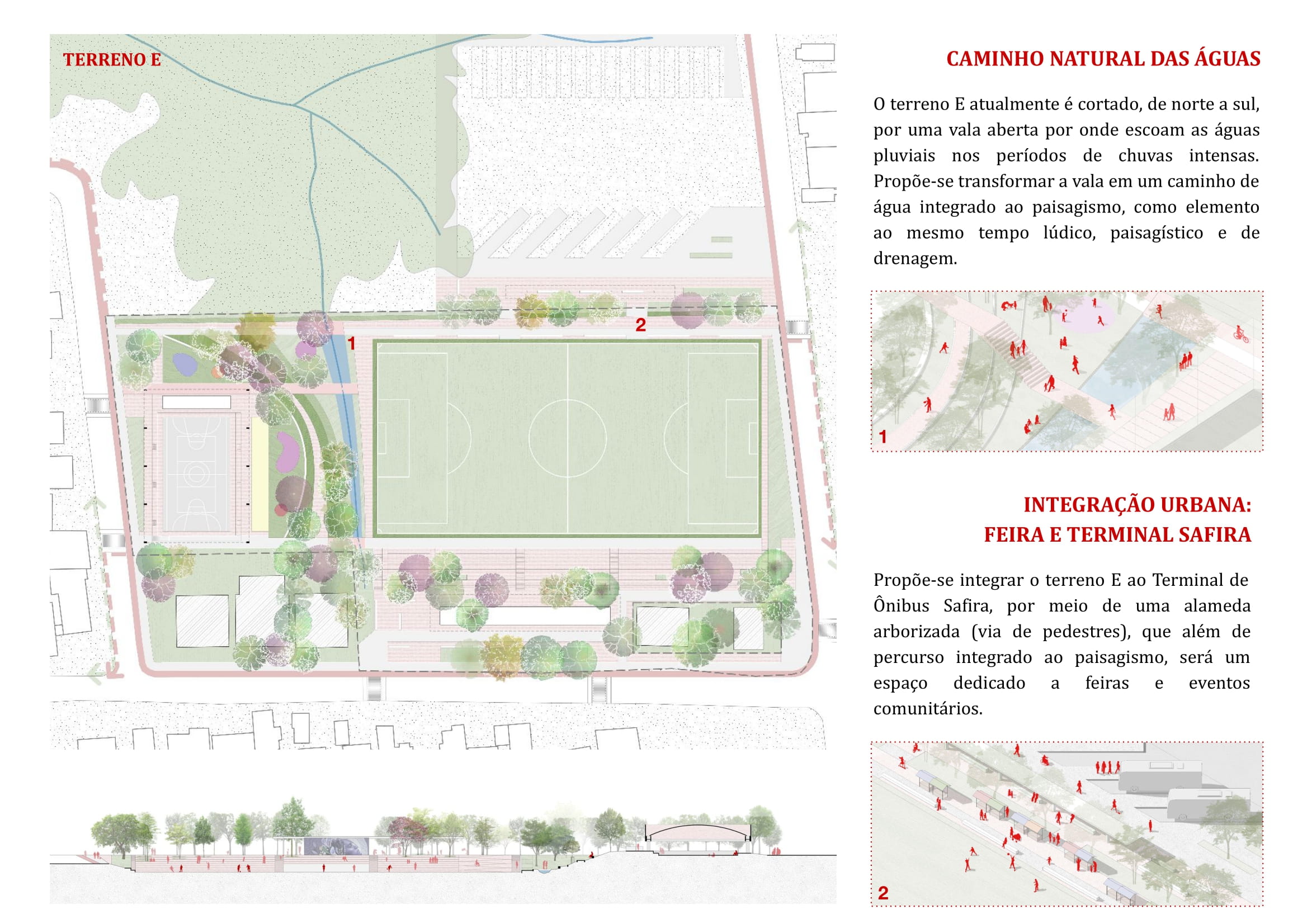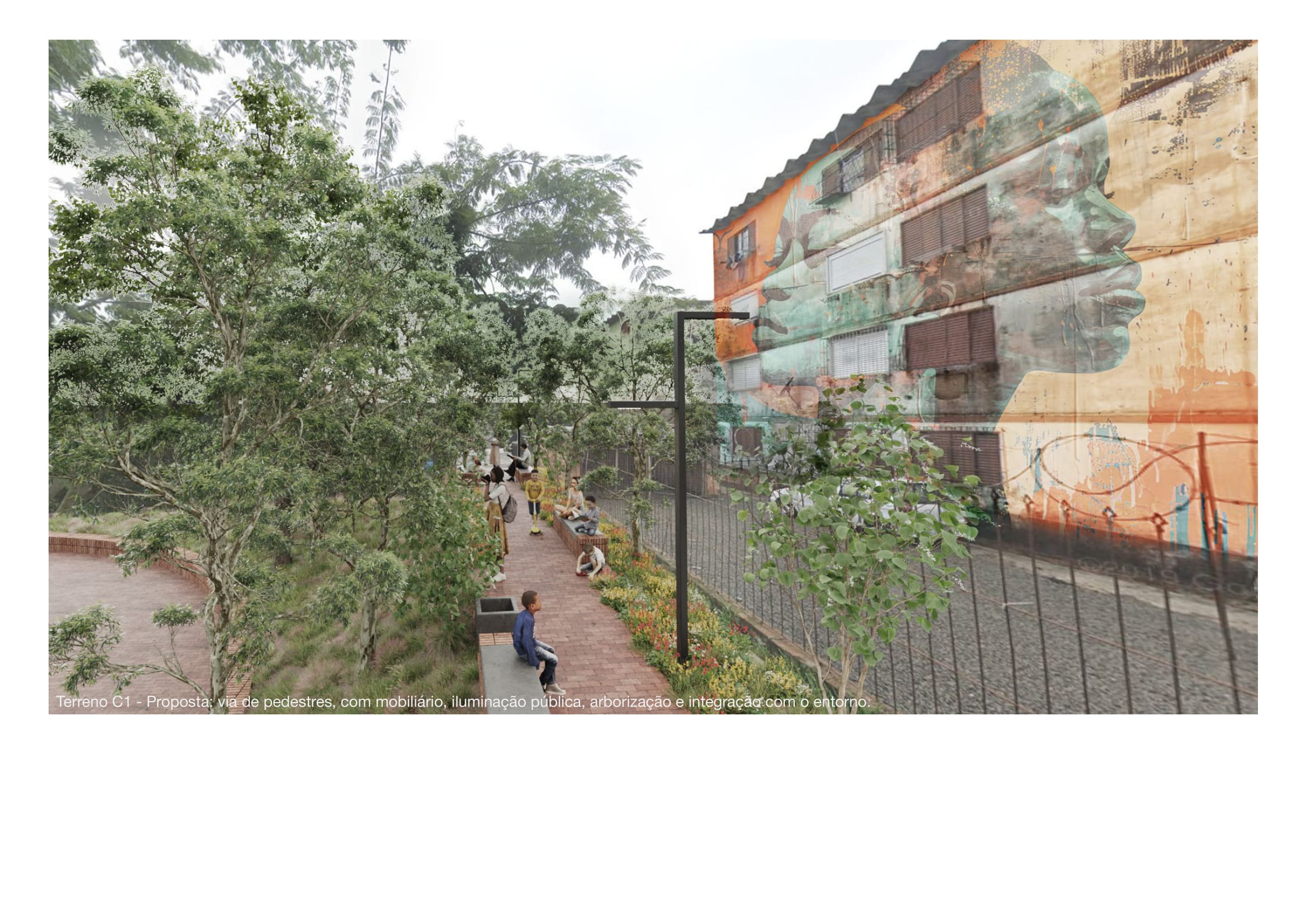 Propõe-se utilizar soluções baseadas na natureza como recursos para a gestão sustentável das águas pluviais: criação de patamares de amortecimento; jardins de chuva e arborização com espécies nativas que contribuem para o sistema de drenagem natural. Os patamares com jardins de chuva, para o amortecimento das águas pluviais, os percursos sinuosos e acessíveis, que acompanham as curvas naturais da topografia e a ativação das esquinas permitem a criação de um repertório diversificado de espaços para a apropriação comunitária.