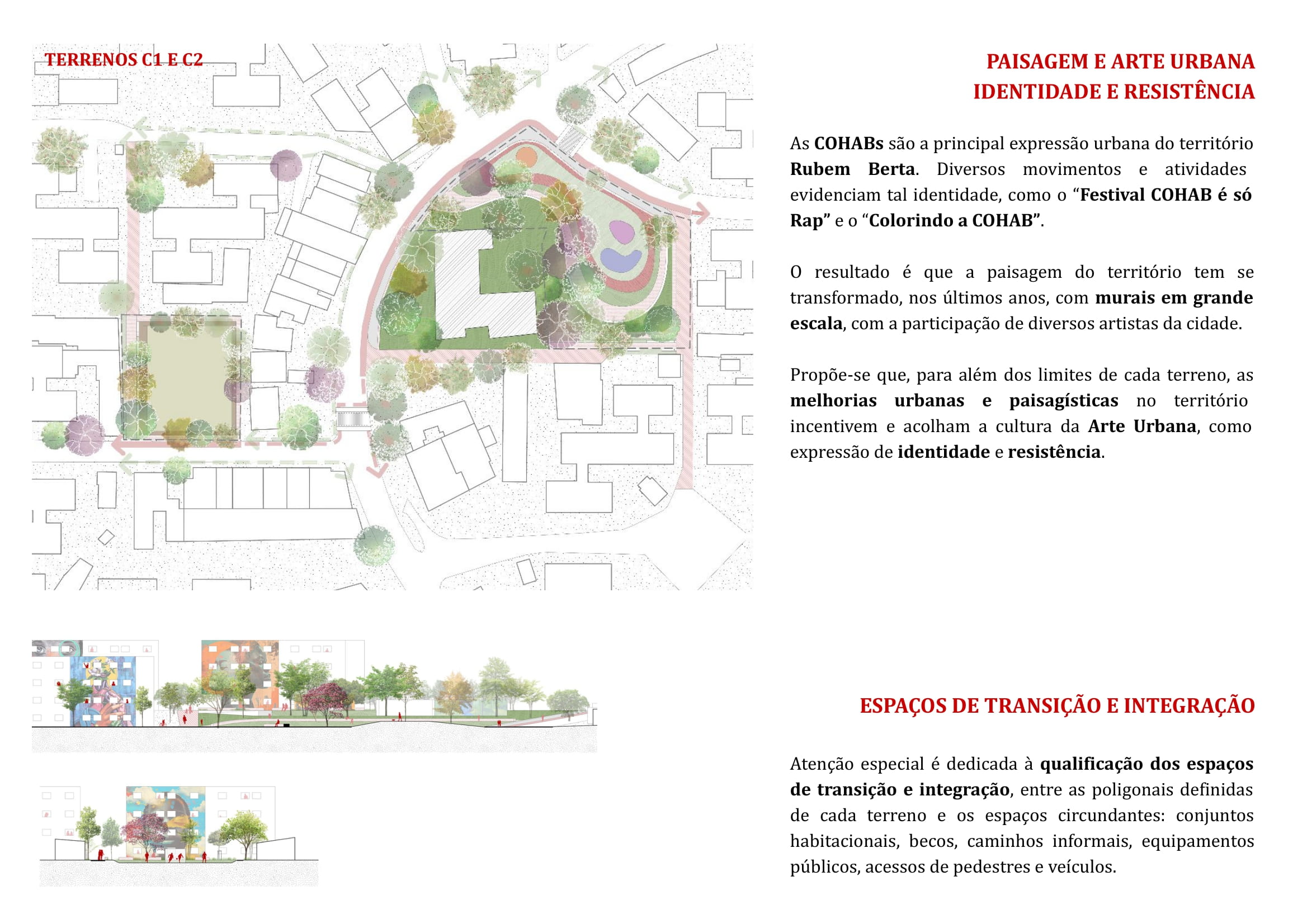 O território de Rubem Berta expressa sua identidade por meio de um sistema de ações que estão associadas principalmente à forte presença da cultura negra e aos movimentos de resistência da comunidade. As COHABs são a principal expressão urbana do território Rubem Berta. Diversos movimentos e atividades evidenciam tal identidade, como o “Festival COHAB é só Rap” e o “Colorindo a COHAB”. O resultado é que a paisagem do território tem se transformado, nos últimos anos, com murais em grande escala, com a participação de diversos artistas da cidade. Propõe-se que, para além dos limites de cada terreno, as melhorias urbanas e paisagísticas no território incentivem e acolham a cultura da Arte Urbana, como expressão de identidade e resistência.