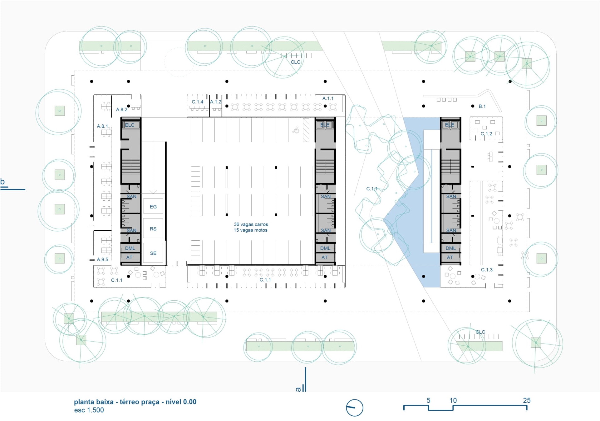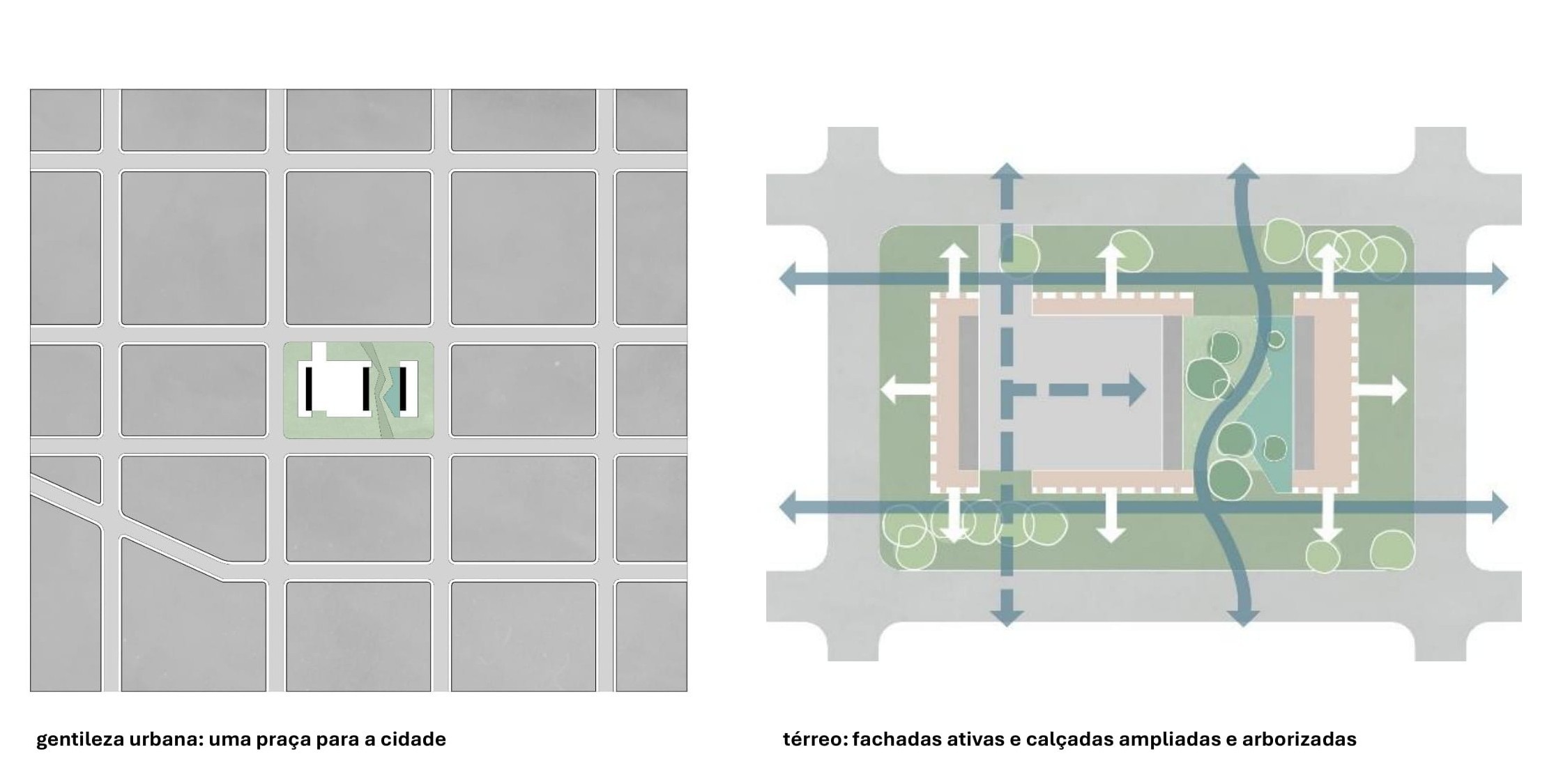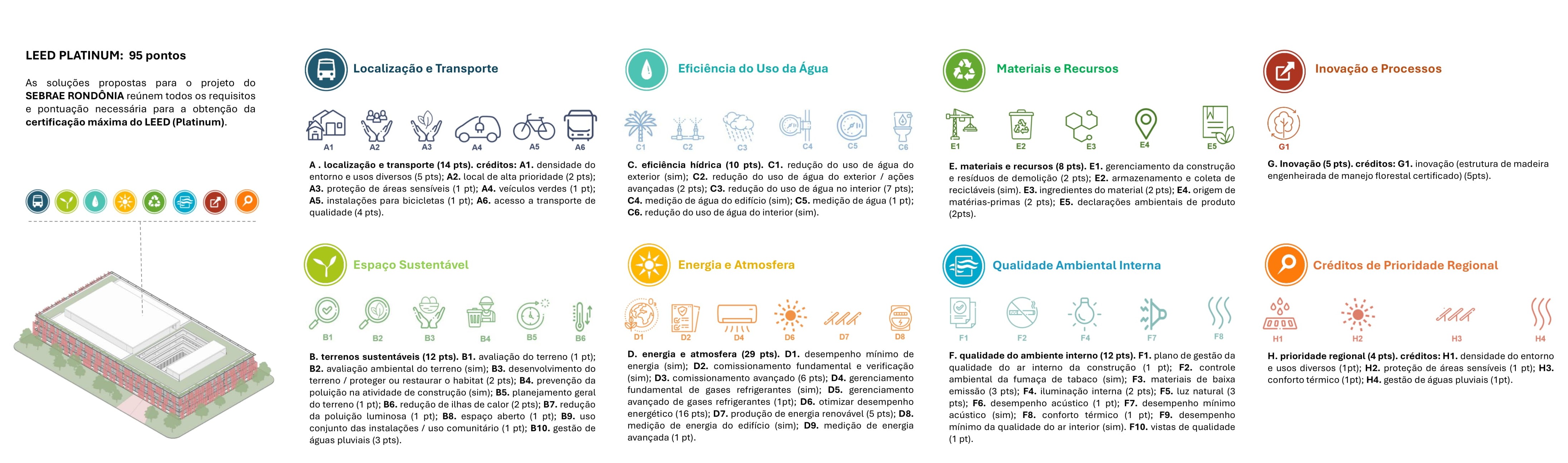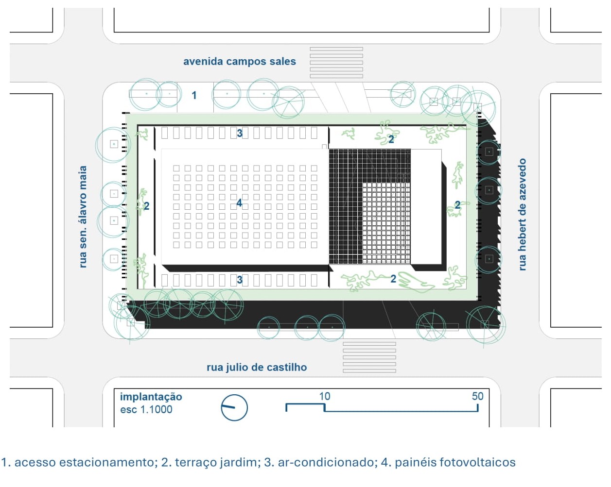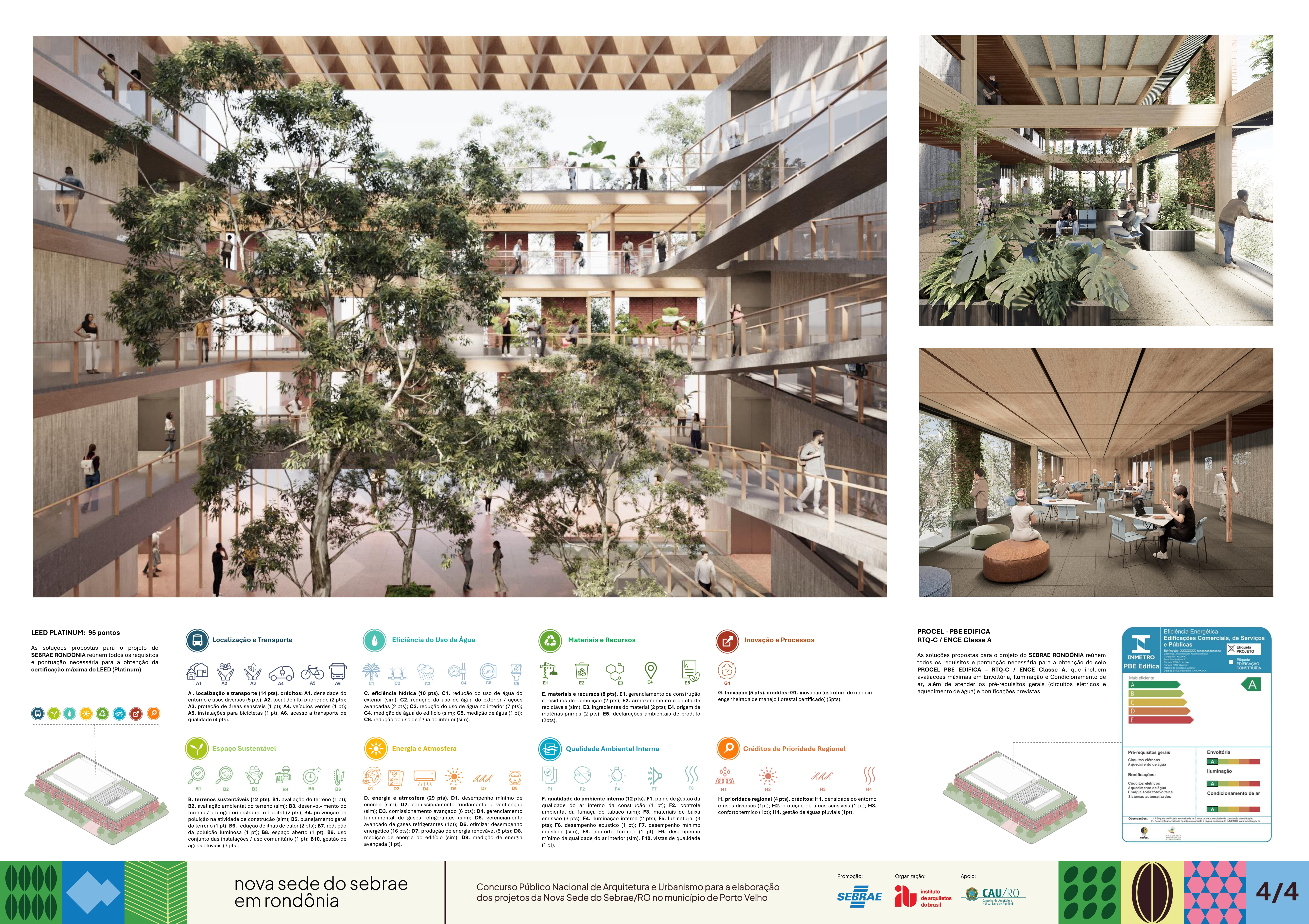 A proposta tem como premissa a preservação da vegetação existente e sua integração ao passeio público da cidade, além da criação de espaços arborizados na praça coberta, com espécies nativas da Amazônia. Os canteiros das calçadas e a praça interna do pavimento térreo serão configurados como jardins de chuva, que integram as soluções baseadas na natureza do projeto. O espelho d’água, além da composição paisagística, será também um reservatório para a retenção, o tratamento e o reaproveitamento de águas pluviais. Os jardins internos, das áreas de convivência e descompressão, contribuem para o conforto ambiental dos espaços internos. O terraço-jardim, além de espaço de fruição e convívio, contribui para reduzir a emissão de calor e aumentar a inércia térmica da edificação, cujas soluções habilitam o projeto para a obtenção da certificação LEED (Platinum) e PBE EDIFICA (RTQ-C / ENCE Classe A).