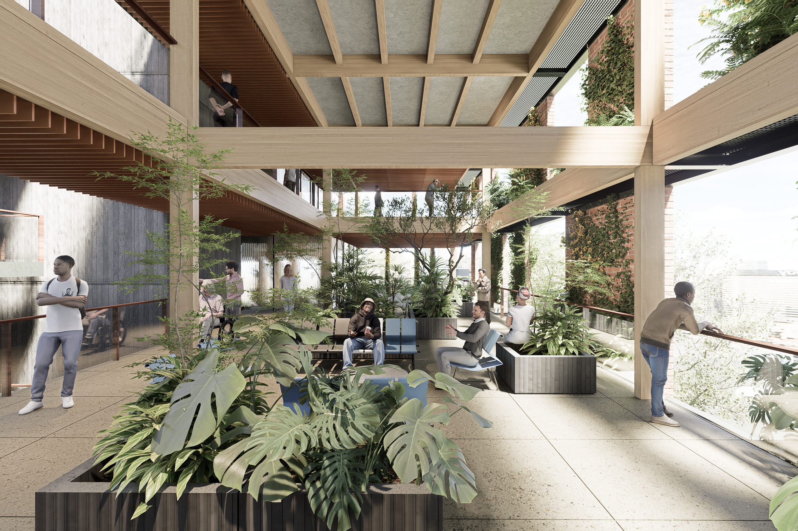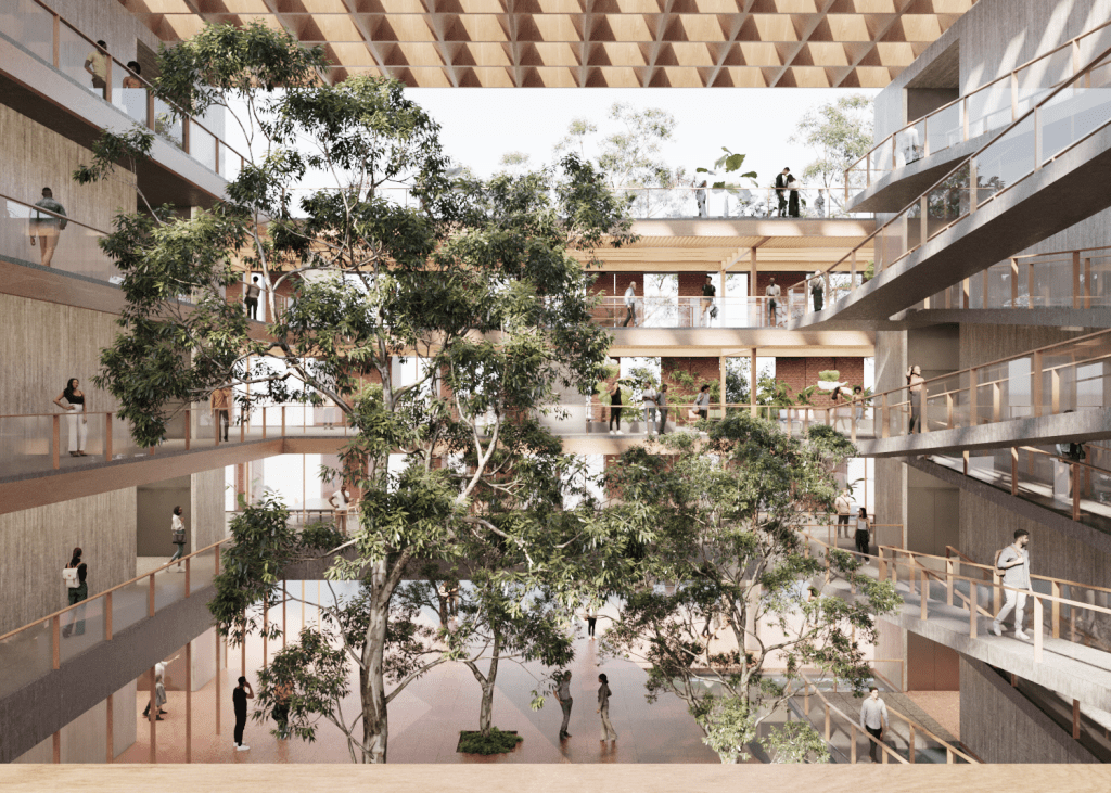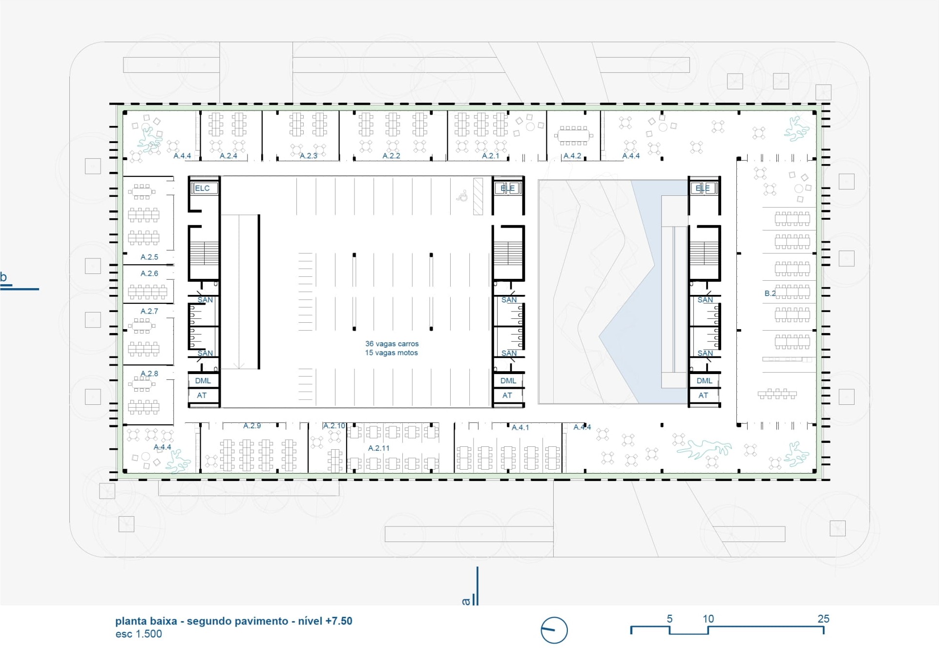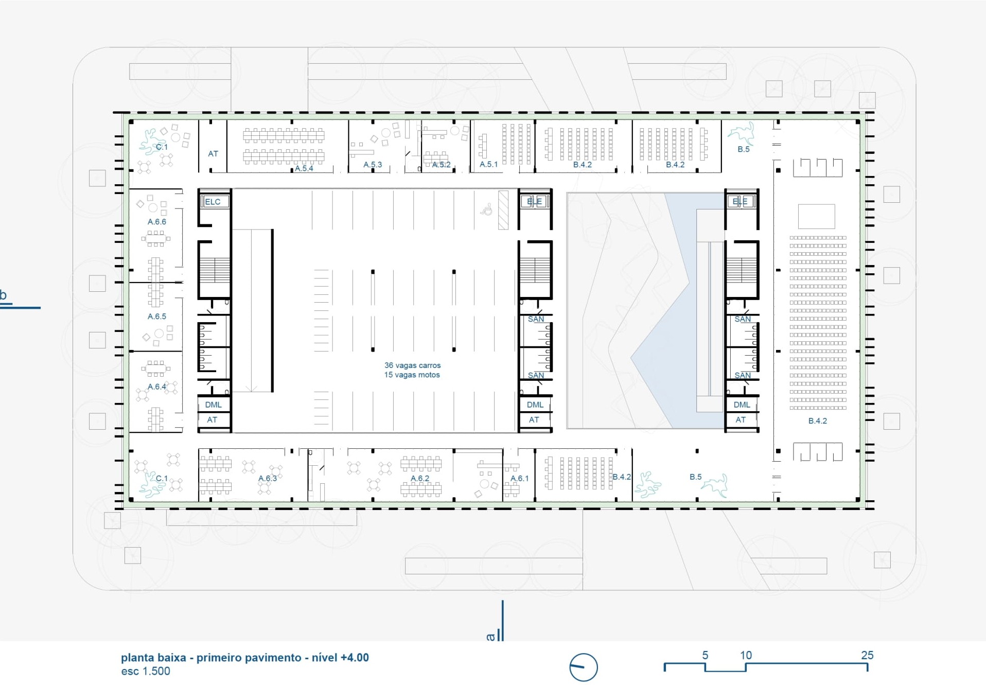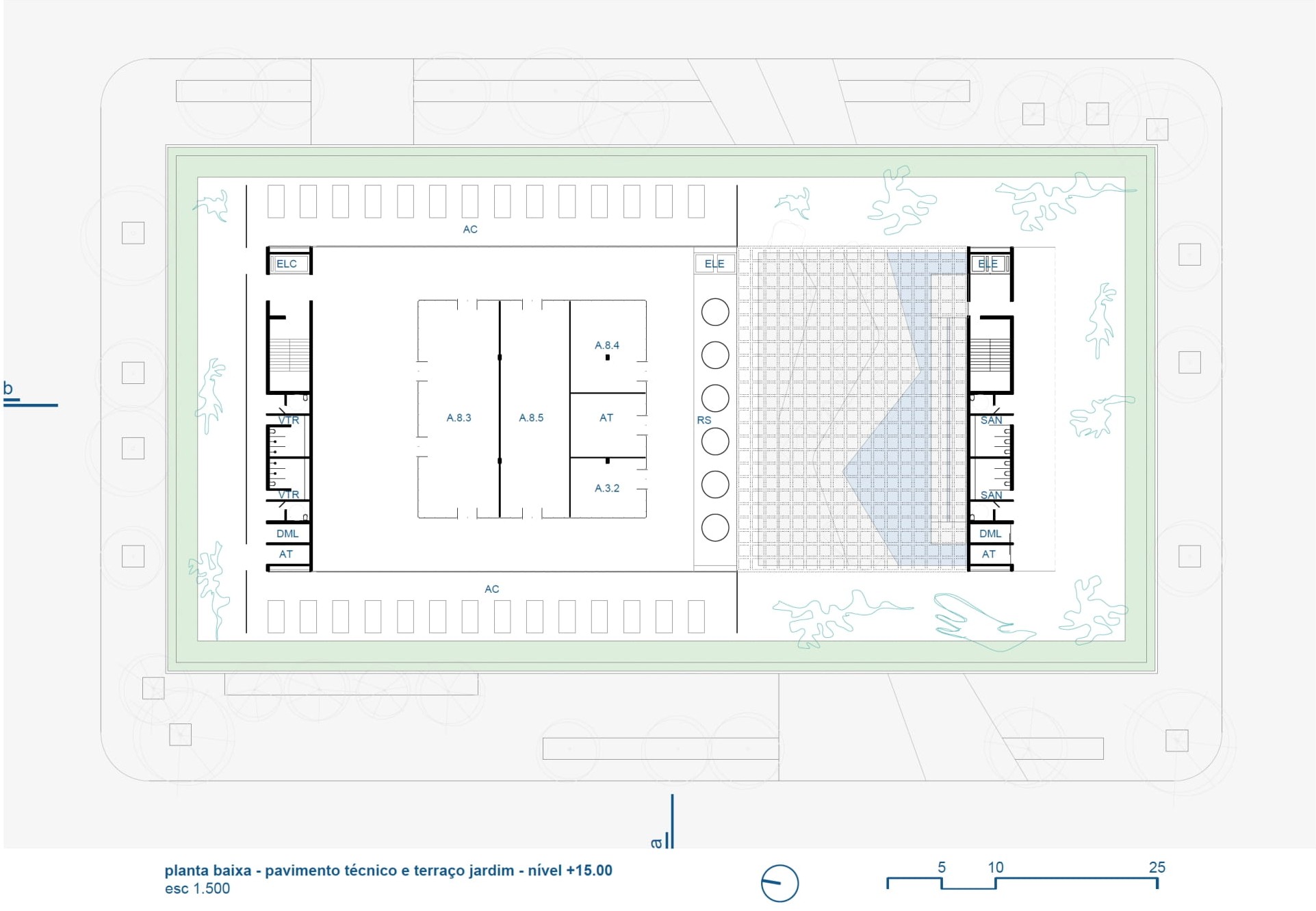 A proposta tem como premissa a preservação da vegetação existente e sua integração ao passeio público da cidade, além da criação de espaços arborizados na praça coberta, com espécies nativas da Amazônia. Os canteiros das calçadas e a praça interna do pavimento térreo serão configurados como jardins de chuva, que integram as soluções baseadas na natureza do projeto. O espelho d’água, além da composição paisagística, será também um reservatório para a retenção, o tratamento e o reaproveitamento de águas pluviais. Os jardins internos, das áreas de convivência e descompressão, contribuem para o conforto ambiental dos espaços internos. O terraço-jardim, além de espaço de fruição e convívio, contribui para reduzir a emissão de calor e aumentar a inércia térmica da edificação, cujas soluções habilitam o projeto para a obtenção da certificação LEED (Platinum) e PBE EDIFICA (RTQ-C / ENCE Classe A).