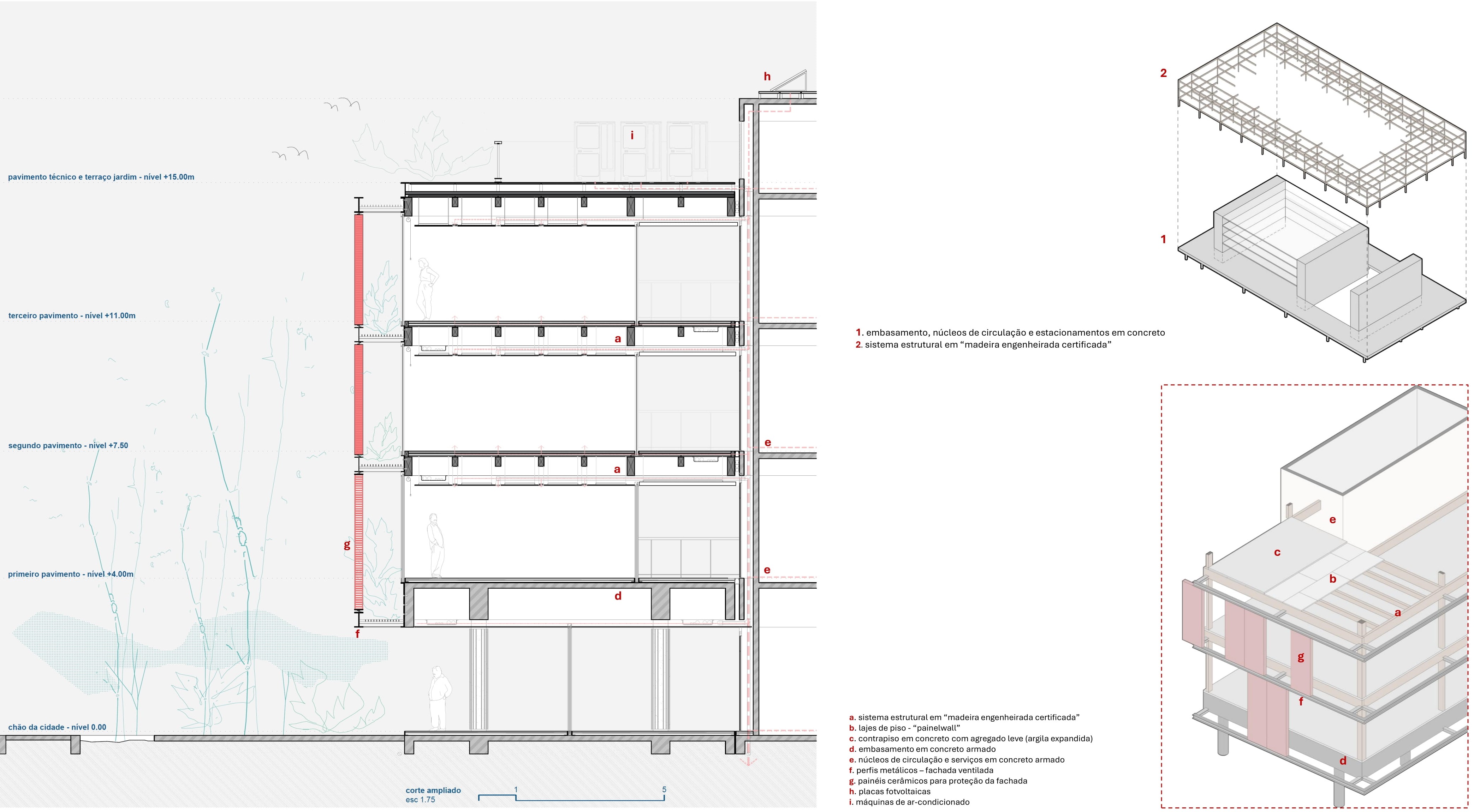A eventual expansão das áreas administrativas precisa ser acompanhada pela necessária ampliação das vagas de estacionamento, a fim de atender à legislação. Nesse sentido, a configuração espacial proposta, de um núcleo vertical de estacionamentos integrado à tipologia do edifício e a técnica construtiva adotada (construção seca e rápida, com peças pré-fabricadas em madeira certificada), permitem que a expansão desejada possa ocorrer de maneira rápida, econômica e sem afetar o funcionamento do edifício existente.