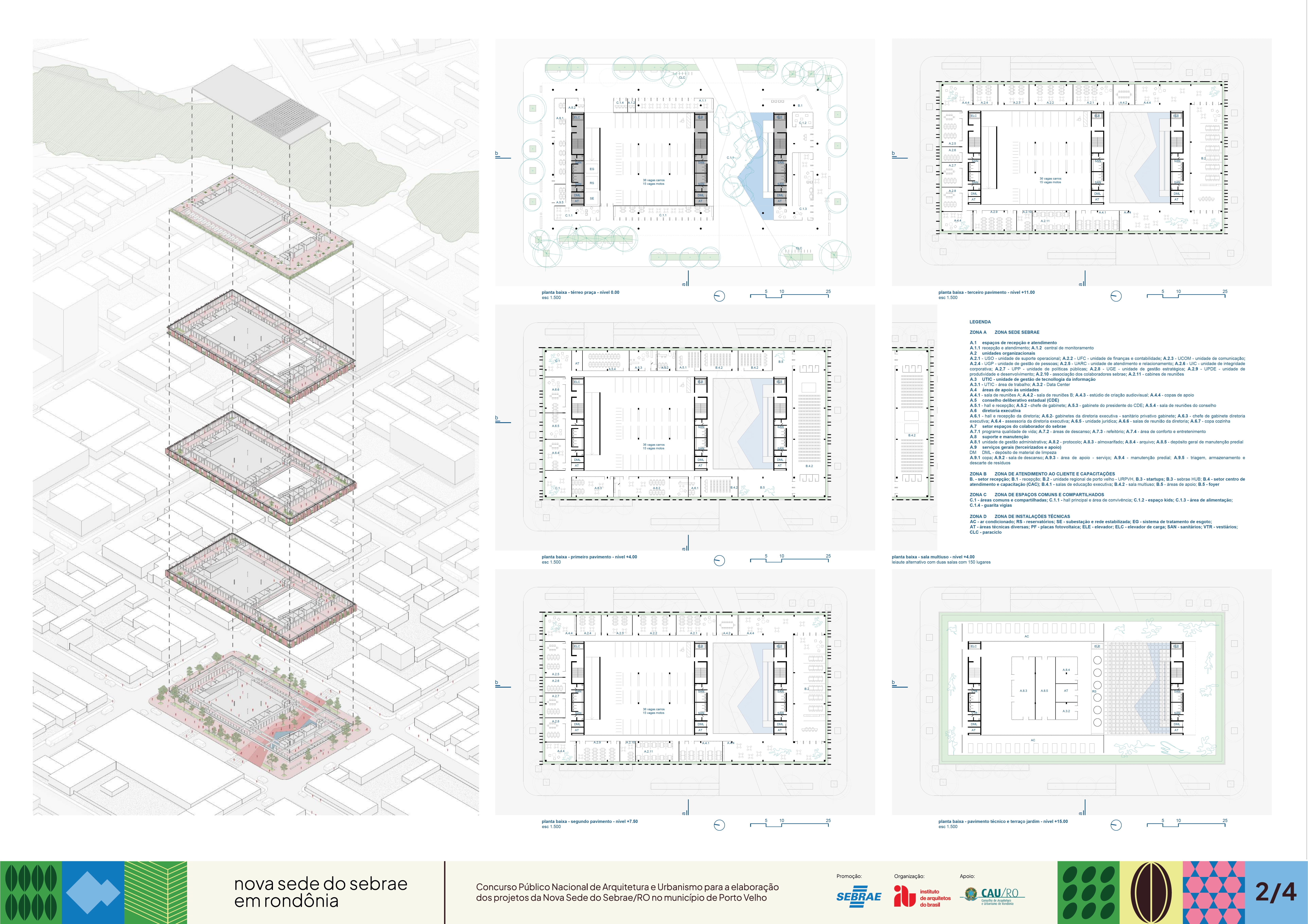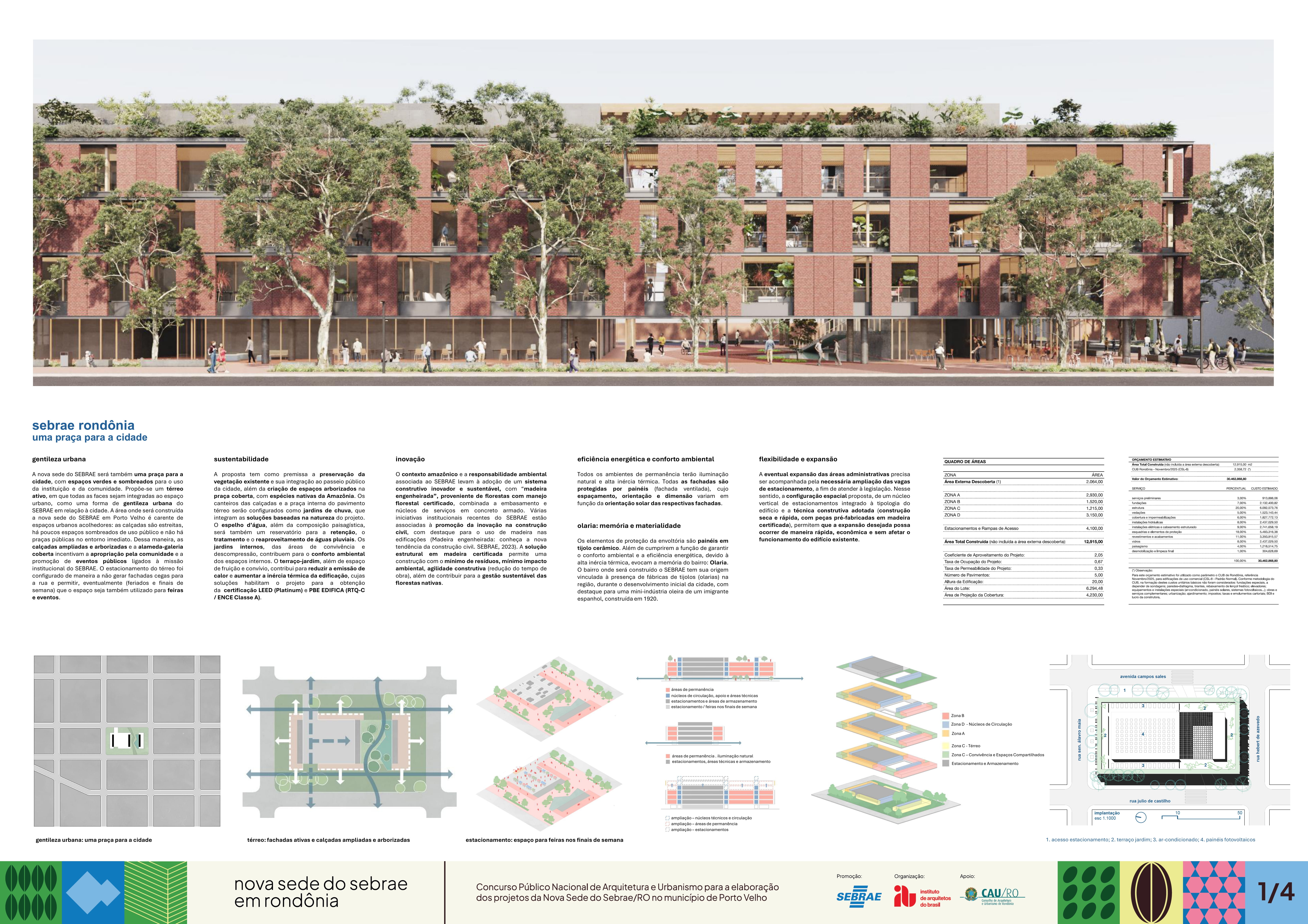 A nova sede do SEBRAE será também uma praça para a cidade, com espaços verdes e sombreados para o uso da instituição e da comunidade. Propõe-se um térreo ativo, em que todas as faces sejam integradas ao espaço urbano, como uma forma de gentileza urbana do SEBRAE em relação à cidade. A área onde será construída a nova sede do SEBRAE em Porto Velho é carente de espaços urbanos acolhedores: as calçadas são estreitas, há poucos espaços sombreados de uso público e não há praças públicas no entorno imediato. Dessa maneira, as calçadas ampliadas e arborizadas e a alameda-galeria coberta incentivam a apropriação pela comunidade e a promoção de eventos públicos ligados à missão institucional do SEBRAE. O estacionamento do térreo foi configurado de maneira a não gerar fachadas cegas para a rua e permitir, eventualmente (feriados e finais de semana) que o espaço seja também utilizado para feiras e eventos.