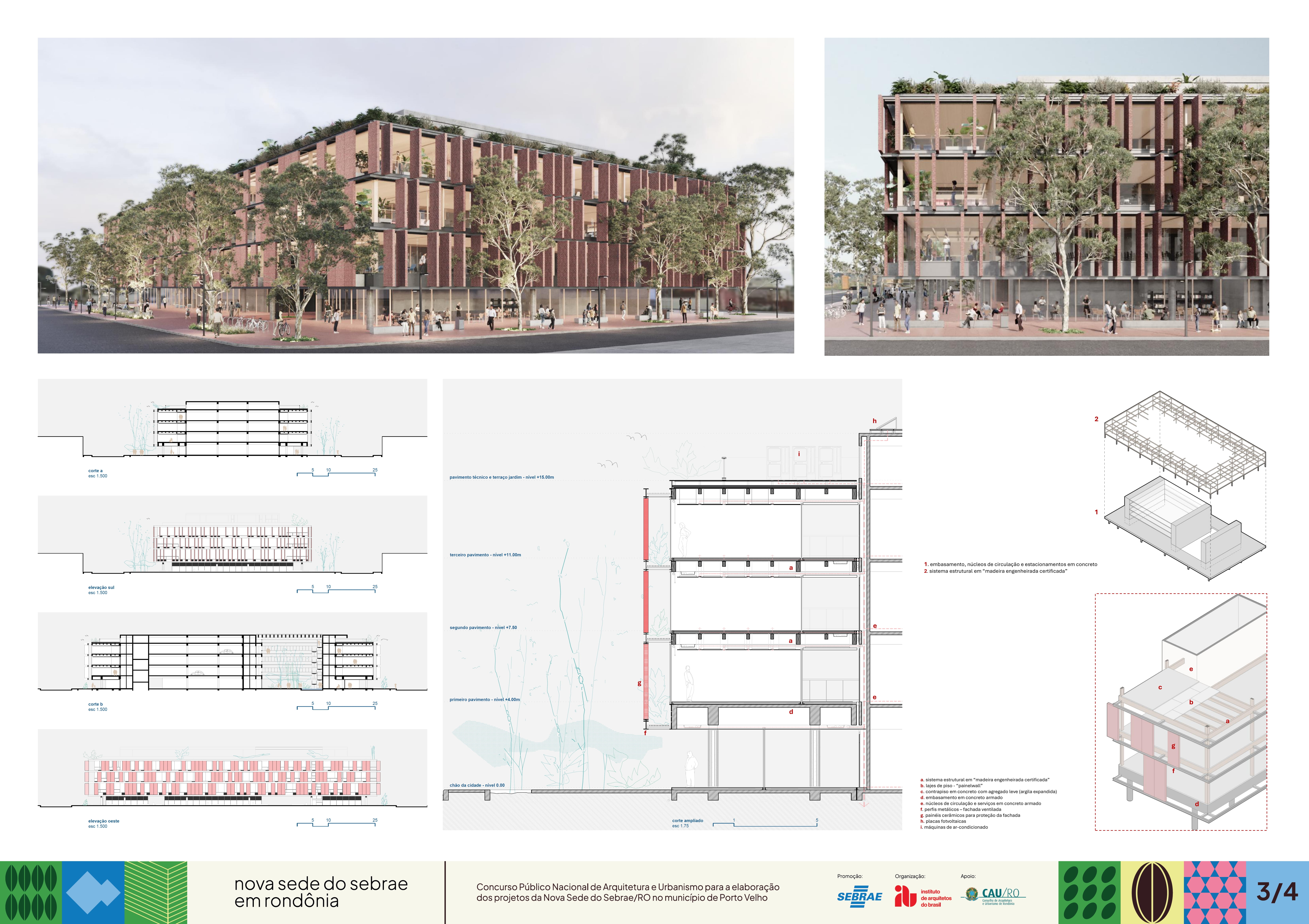 O contexto amazônico e a responsabilidade ambiental associada ao SEBRAE levam à adoção de um sistema construtivo inovador e sustentável, com “madeira engenheirada”, proveniente de florestas com manejo florestal certificado, combinada a embasamento e núcleos de serviços em concreto armado. Várias iniciativas institucionais recentes do SEBRAE estão associadas à promoção da inovação na construção civil, com destaque para o uso de madeira nas edificações (Madeira engenheirada: conheça a nova tendência da construção civil. SEBRAE, 2023). A solução estrutural em madeira certificada permite uma construção com o mínimo de resíduos, mínimo impacto ambiental, agilidade construtiva (redução do tempo de obra), além de contribuir para a gestão sustentável das florestas nativas.