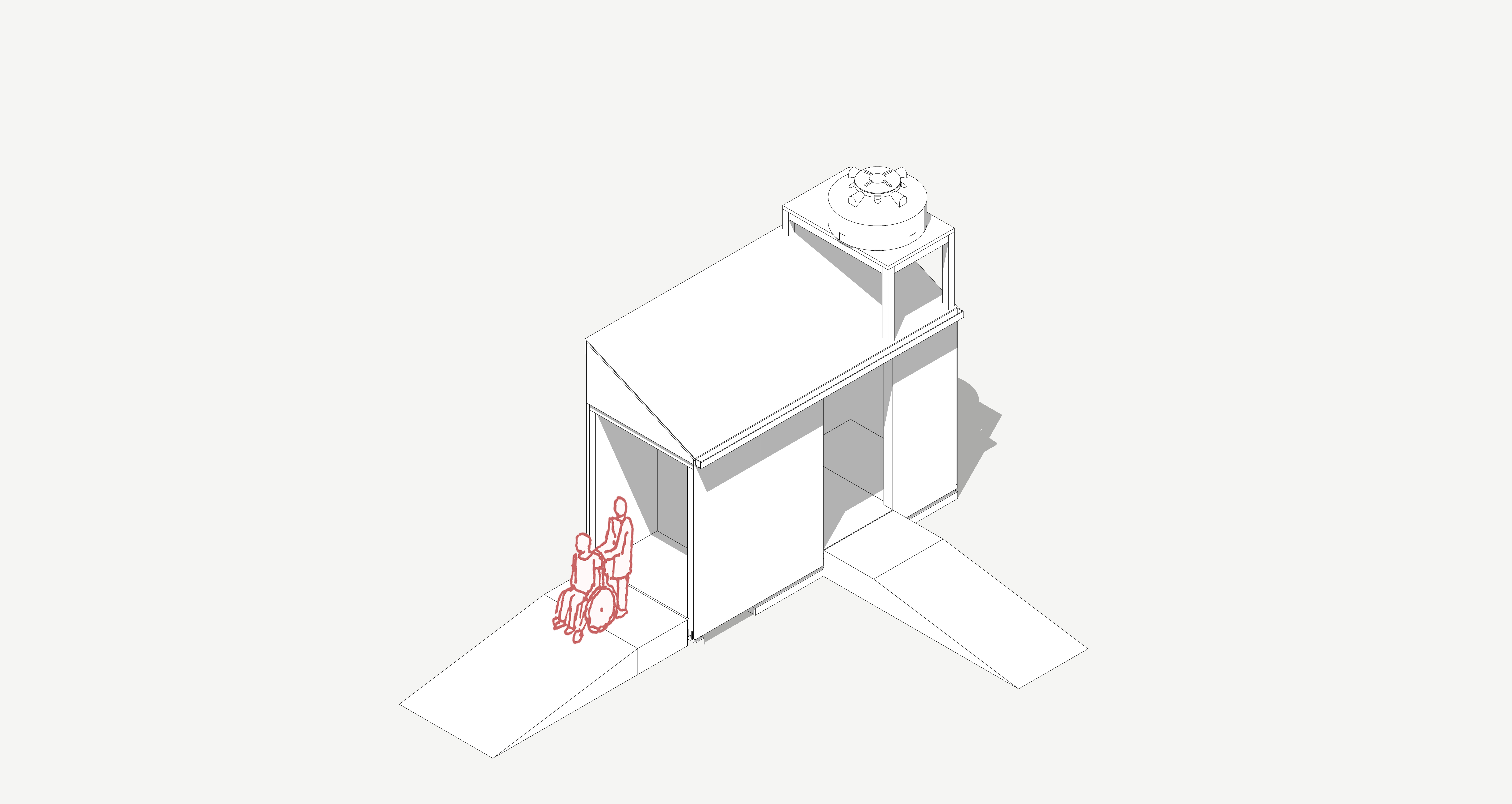 O módulo permite adaptações para atender as demandas de acessibilidade tanto para o sanitário quanto para a área do tanque e máquina de lavar, com pequenos ajustes dimensionais, instalação de rampas externas, barras e retirada de divisórias e portas internas.