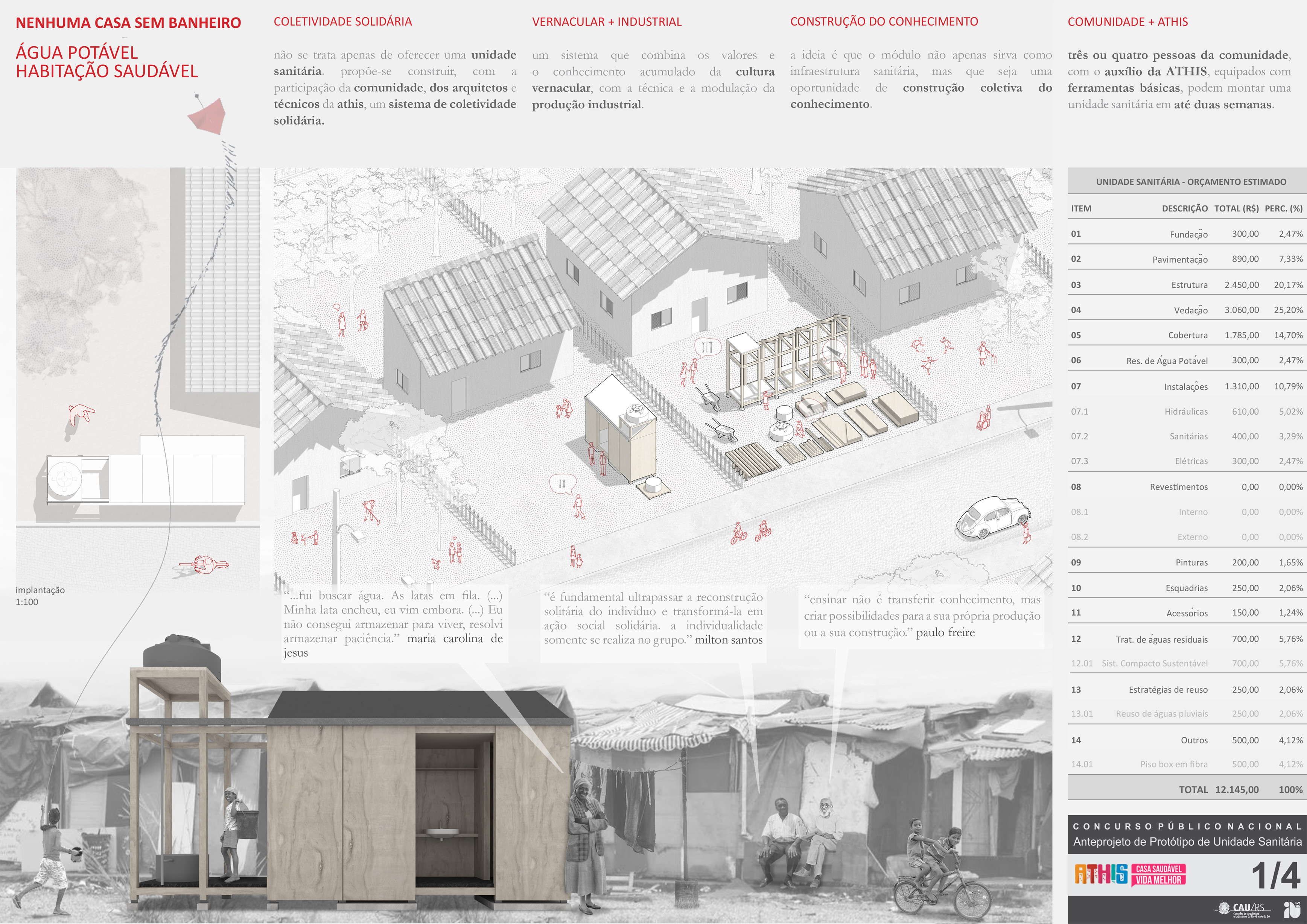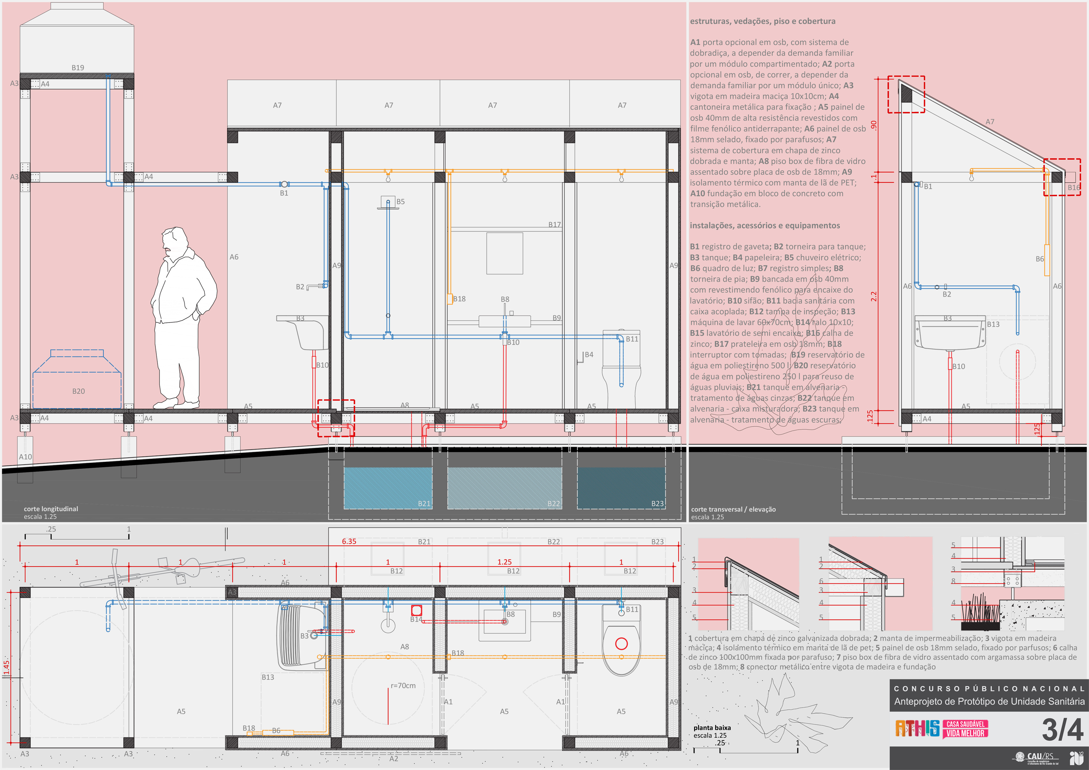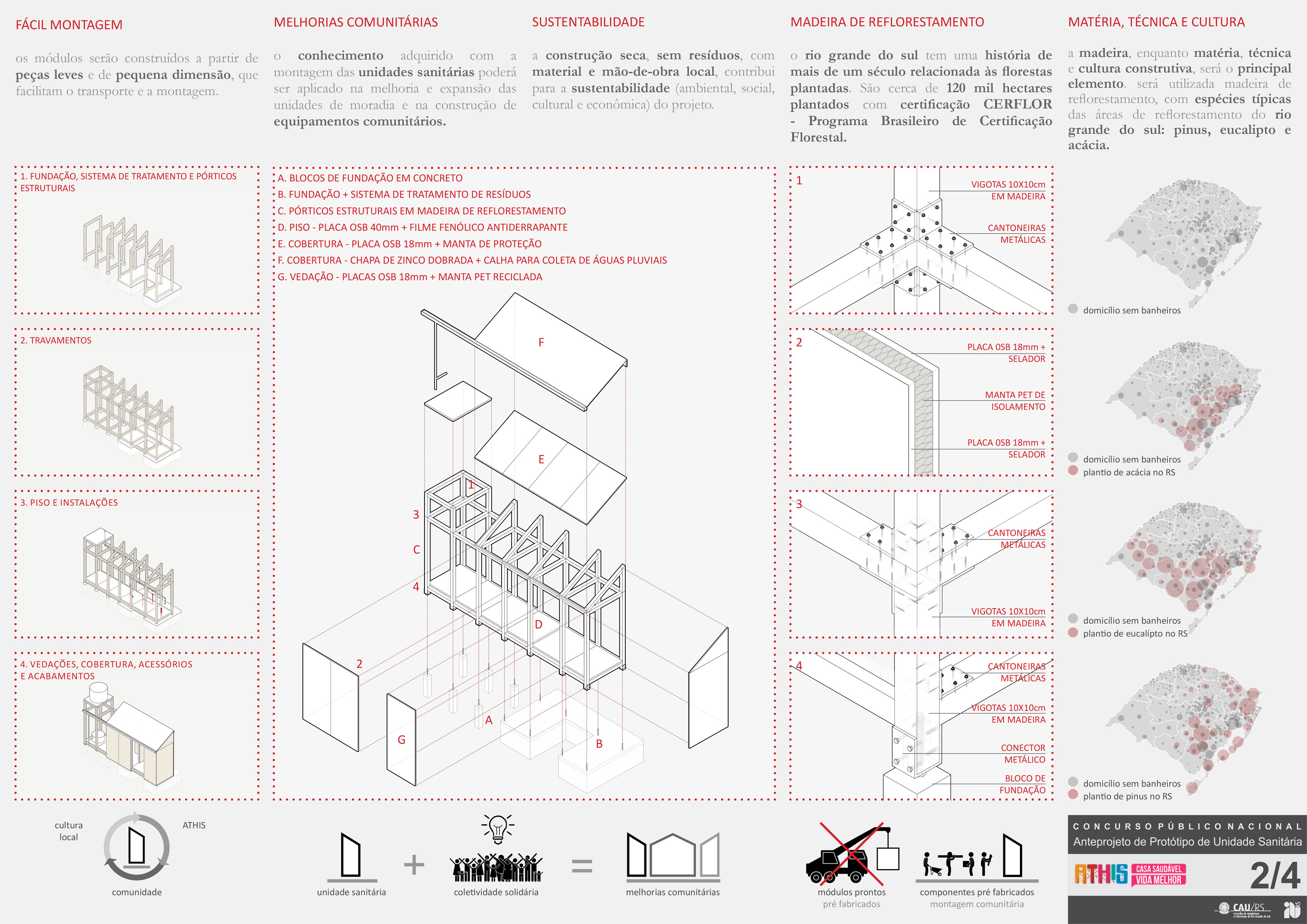 três ou quatro pessoas da comunidade, com o auxílio da ATHIS, equipados com ferramentas básicas, podem montar uma unidade sanitária em até duas semanas.